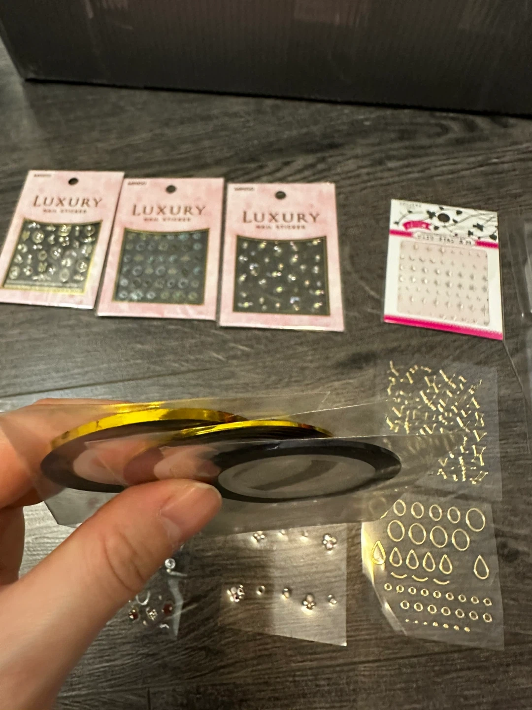 This set includes multiple packs of 'LUXURY Nail Stickers' along with various rhinestones, gems, and gold nail tape. It's a great collection for creating custom nail designs. Many small decorative pieces for detailed work.