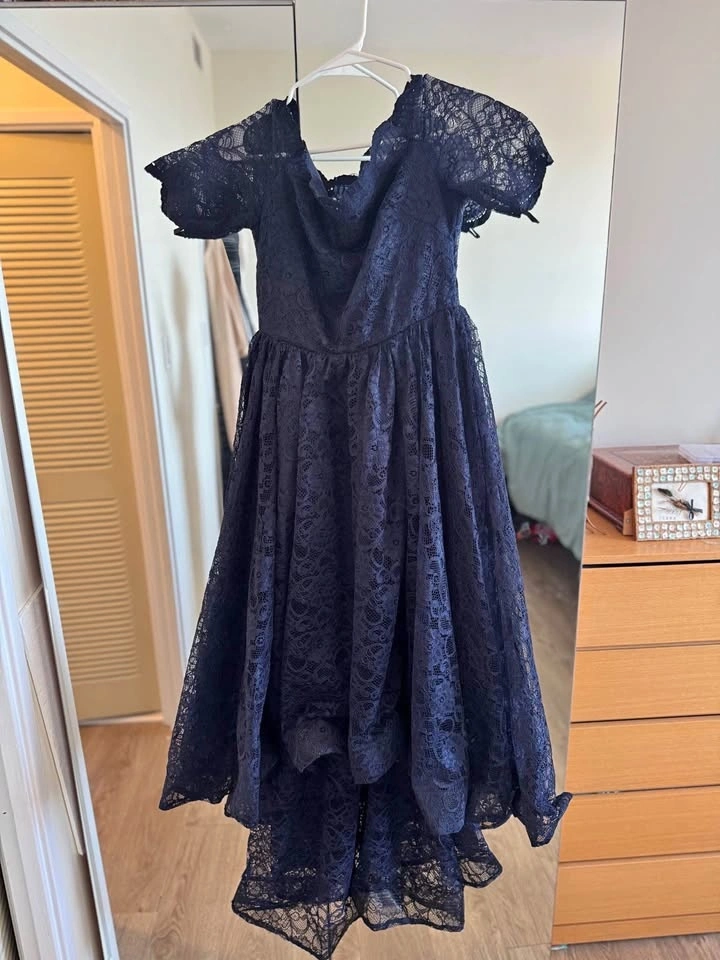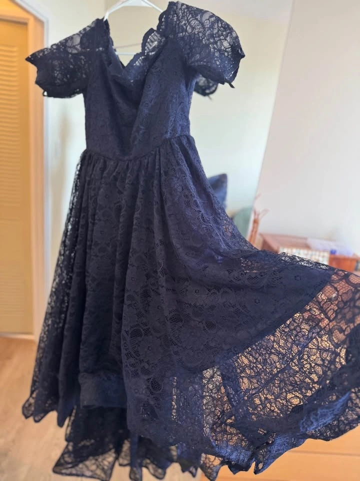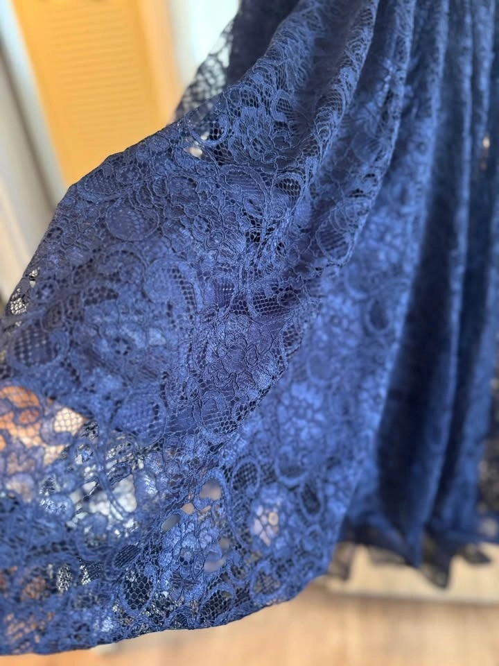 Size M. Stunning navy blue lace dress with an off-the-shoulder neckline, delicate lace detailing, and a flattering high-low hem. Fully lined for comfort. Zipper closure at the back. Gently worn, like new. Smoke-free and pet-free home.