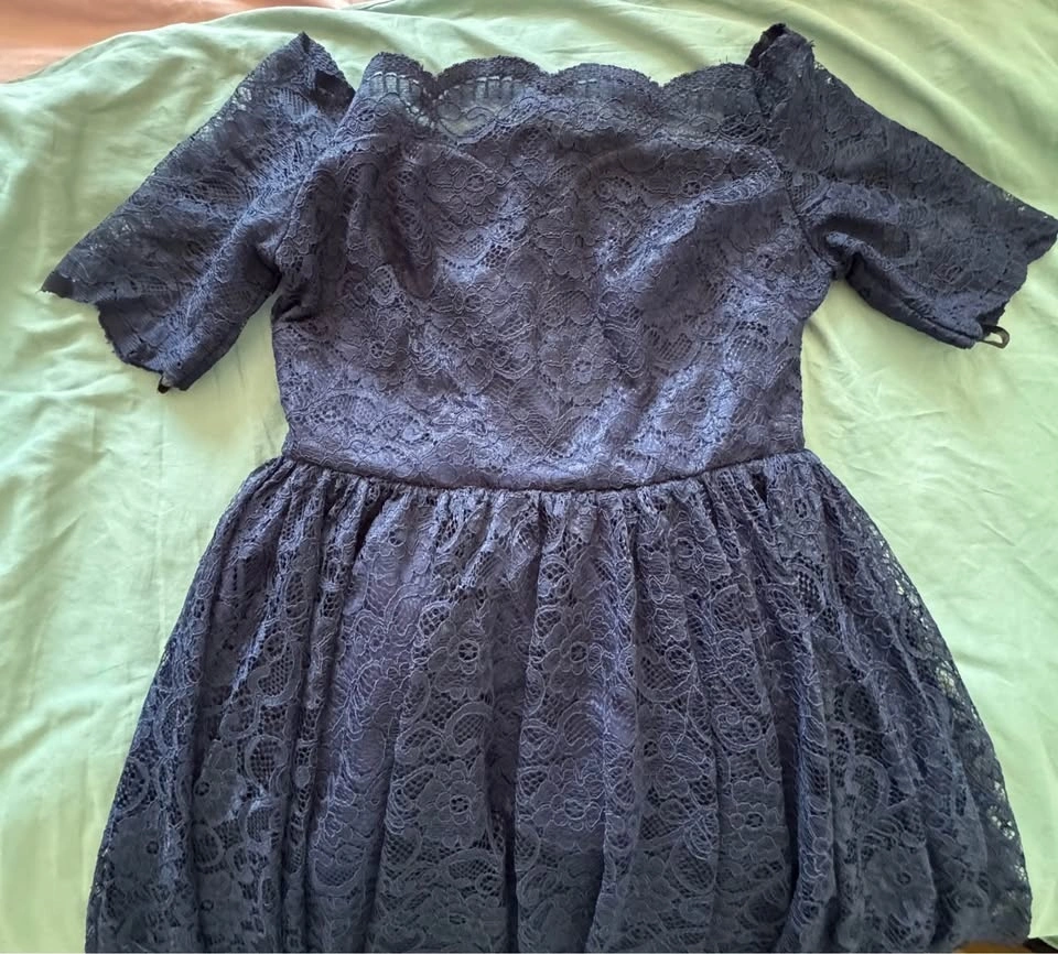 Size M. Stunning navy blue lace dress with an off-the-shoulder neckline, delicate lace detailing, and a flattering high-low hem. Fully lined for comfort. Zipper closure at the back. Gently worn, like new. Smoke-free and pet-free home.