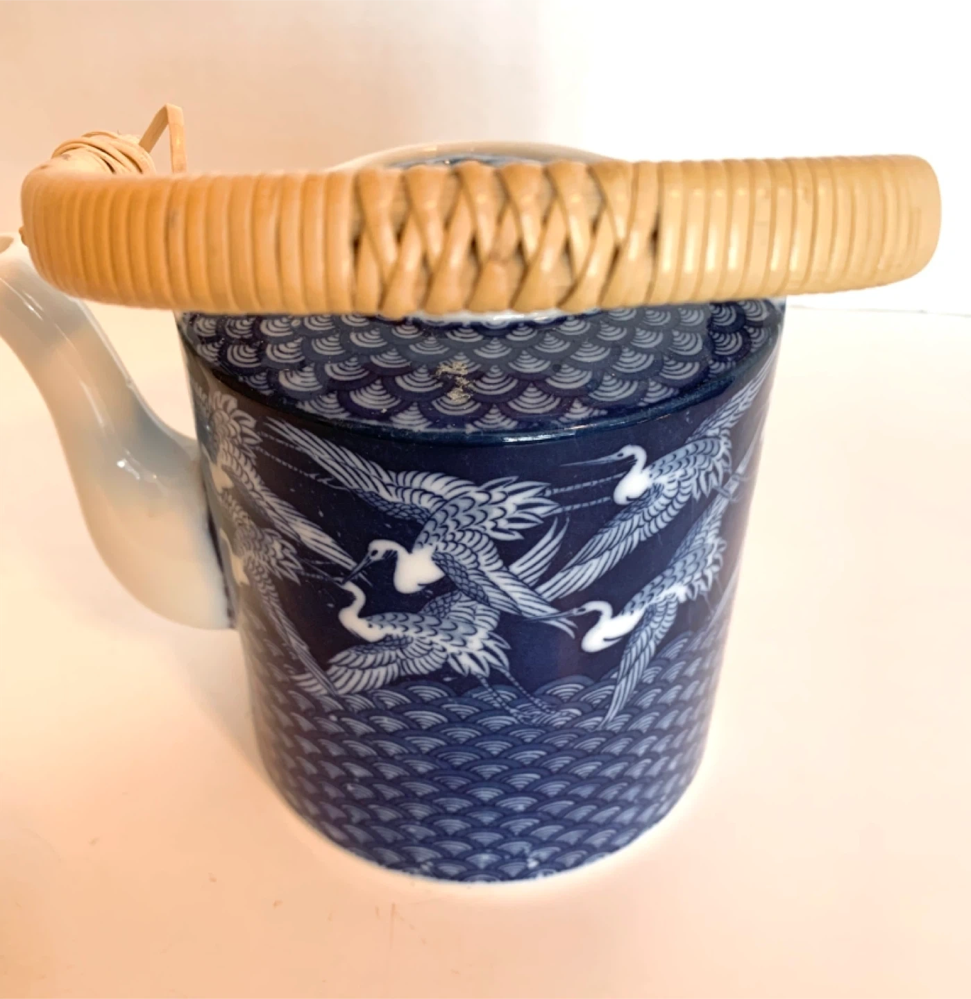 Beautiful ceramic teapot with matching lid. Made in Japan. Blue and white design with cranes in flight. Bamboo handle. Vintage.