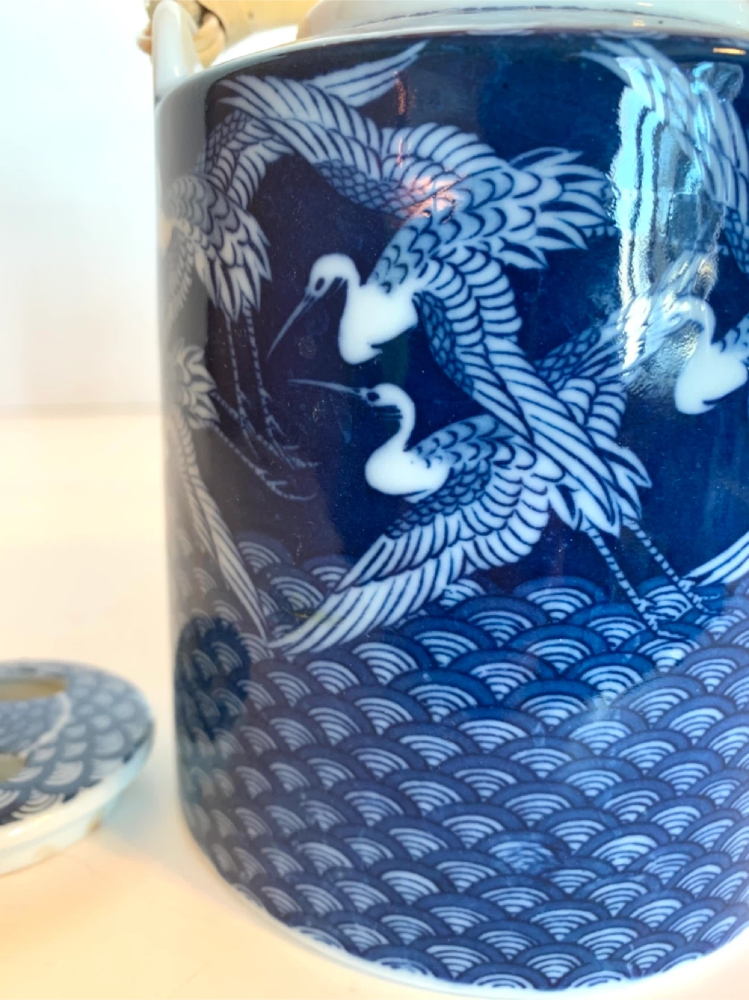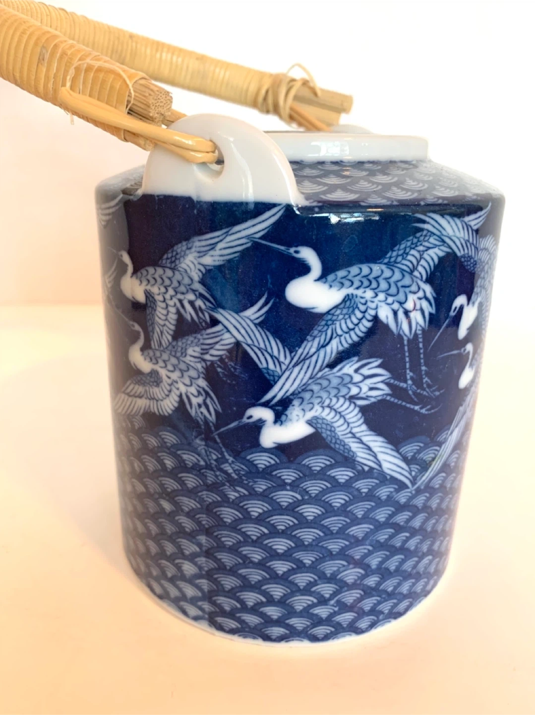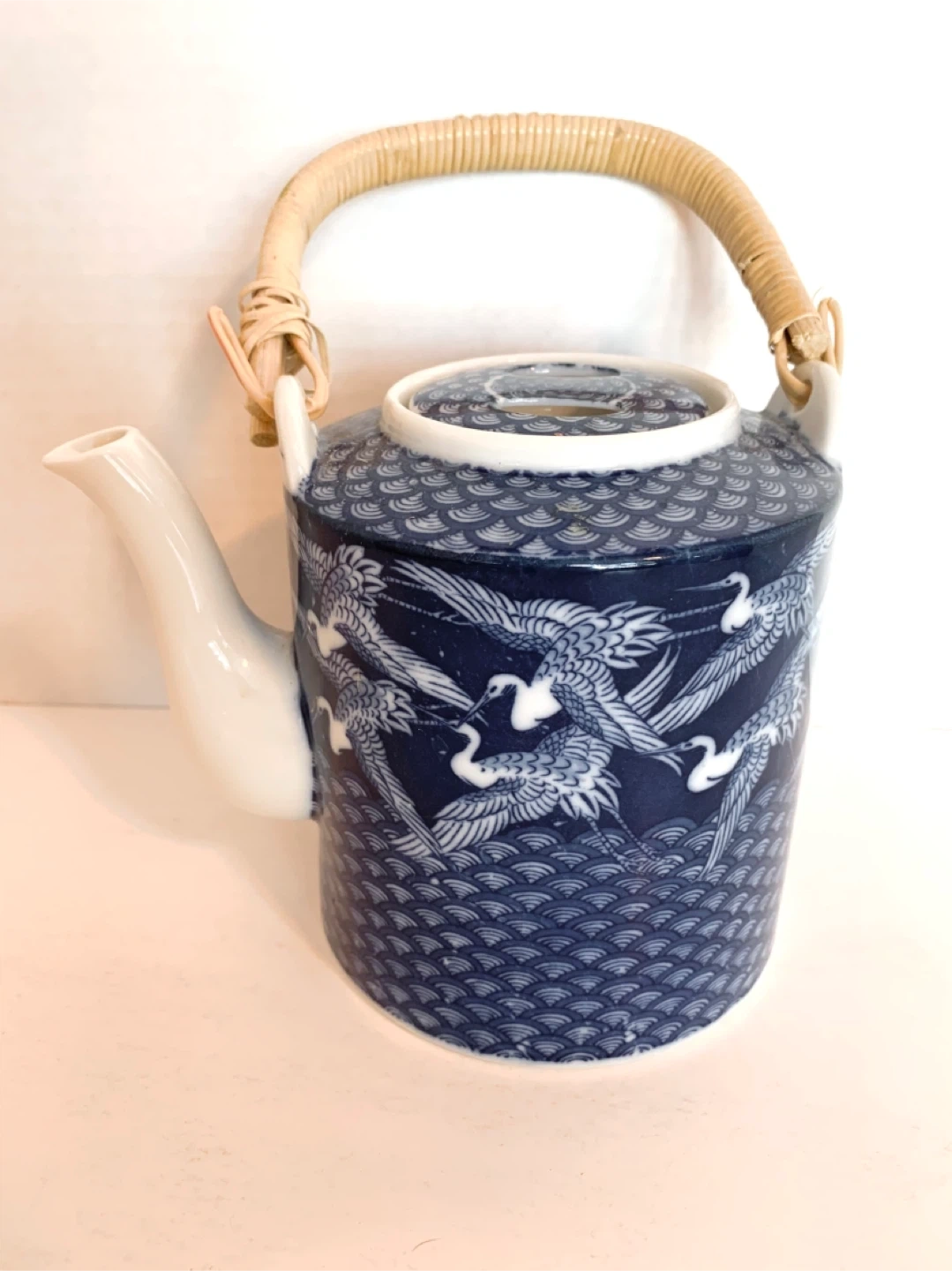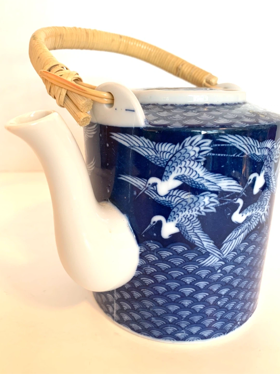 Beautiful ceramic teapot with matching lid. Made in Japan. Blue and white design with cranes in flight. Bamboo handle. Vintage.