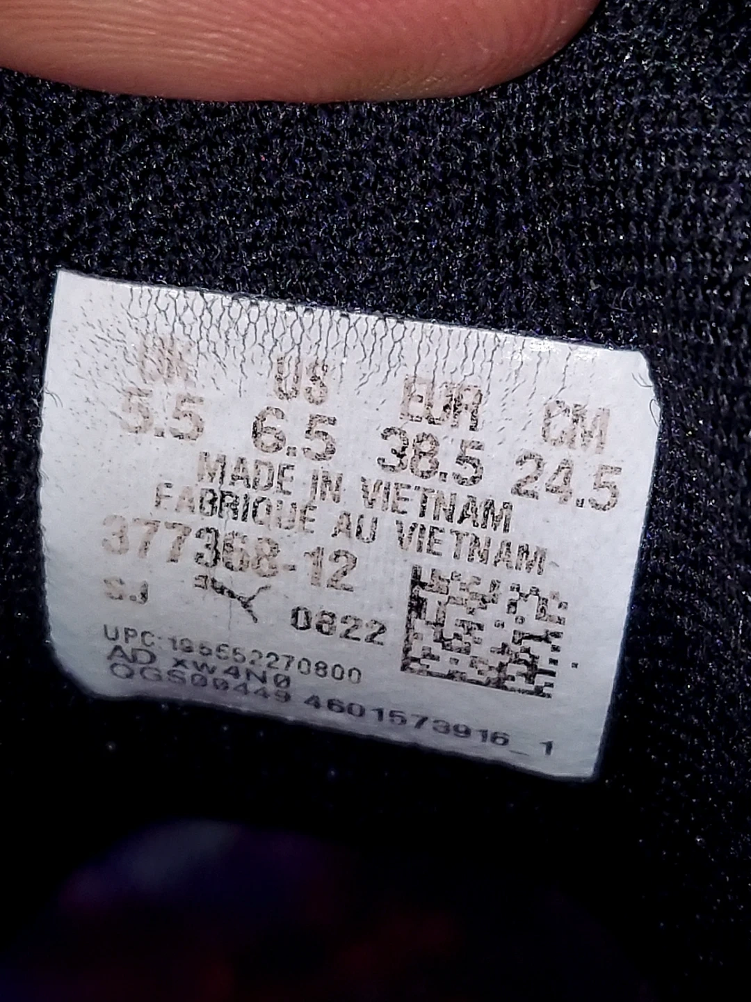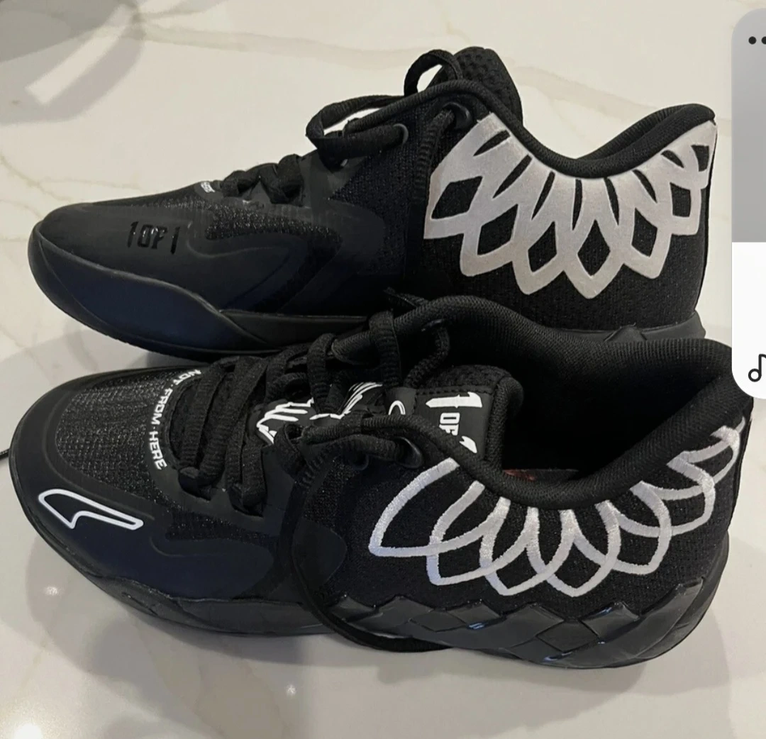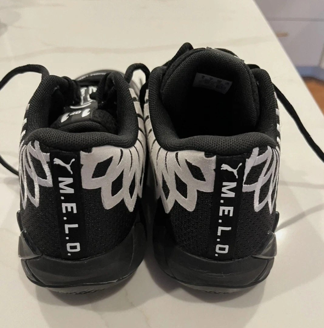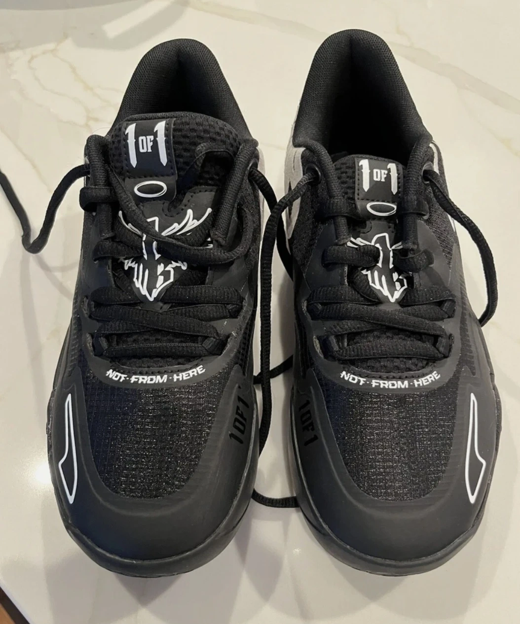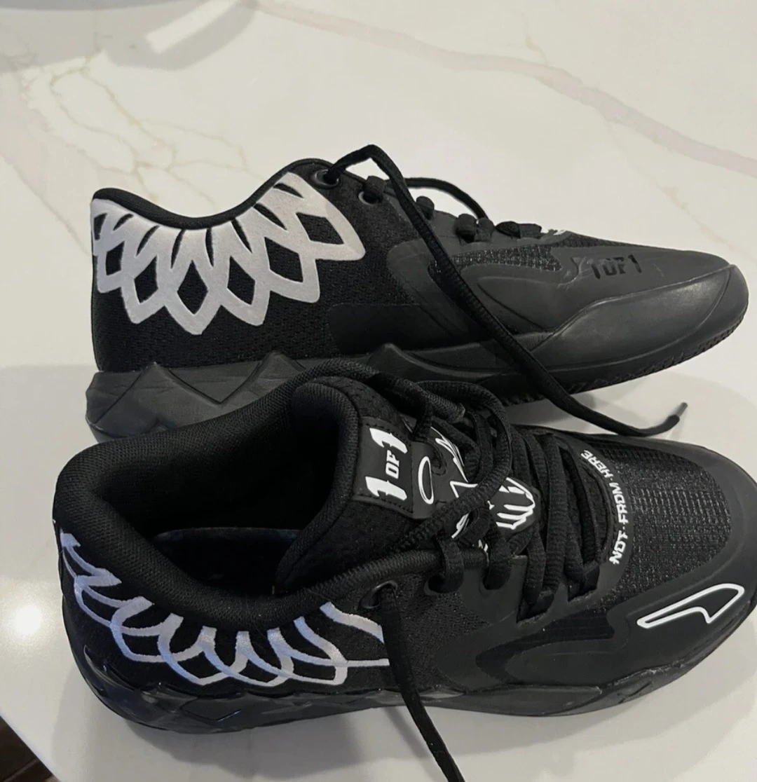 These are a pair of black Puma MB.01 Low basketball shoes. They feature white detailing and the 'Not From Here' graphic. This is the '1 of 1' edition. 6.5