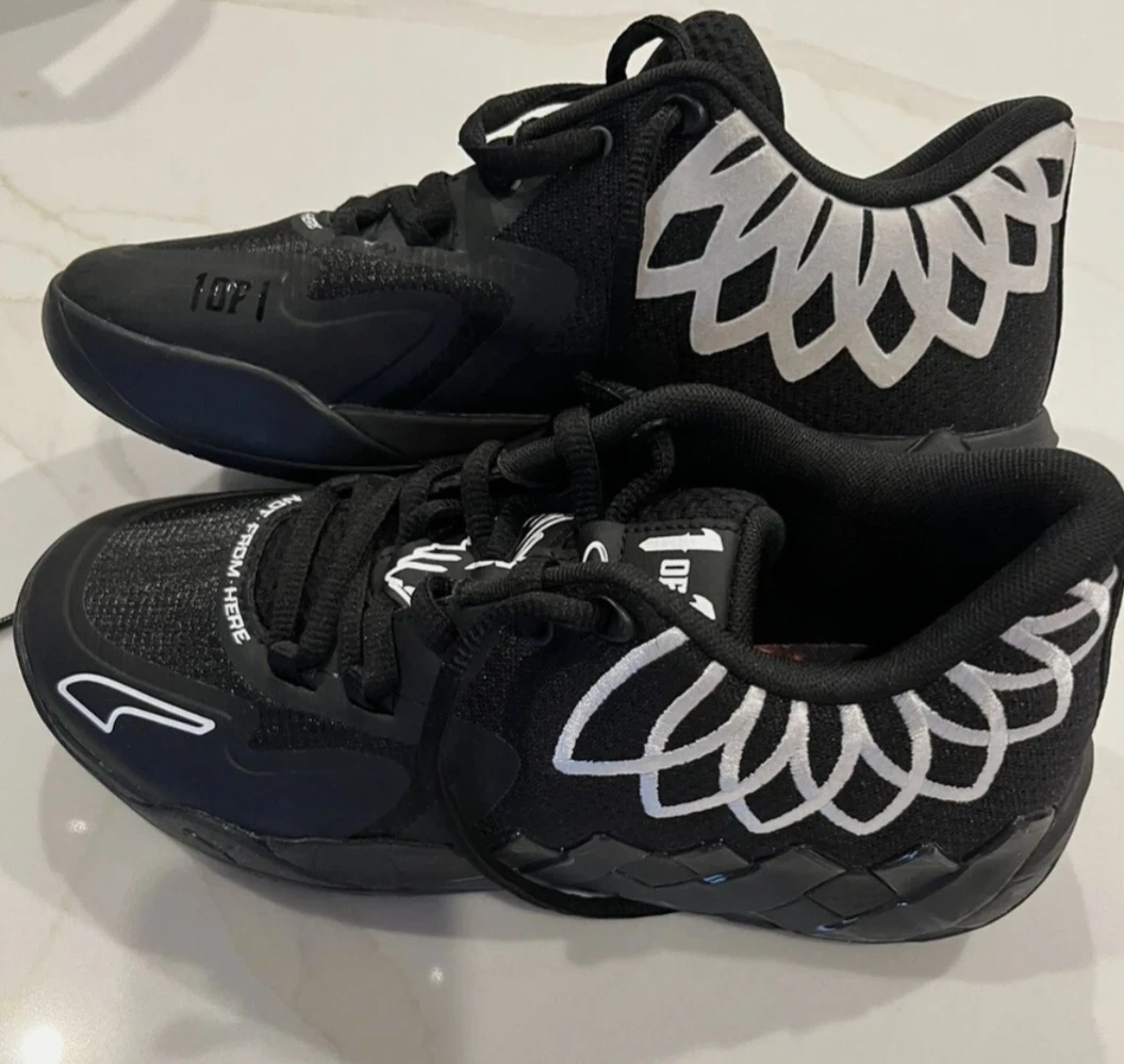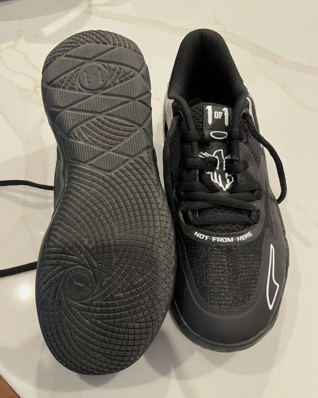 These are a pair of black Puma MB.01 Low basketball shoes. They feature white detailing and the 'Not From Here' graphic. This is the '1 of 1' edition. 6.5