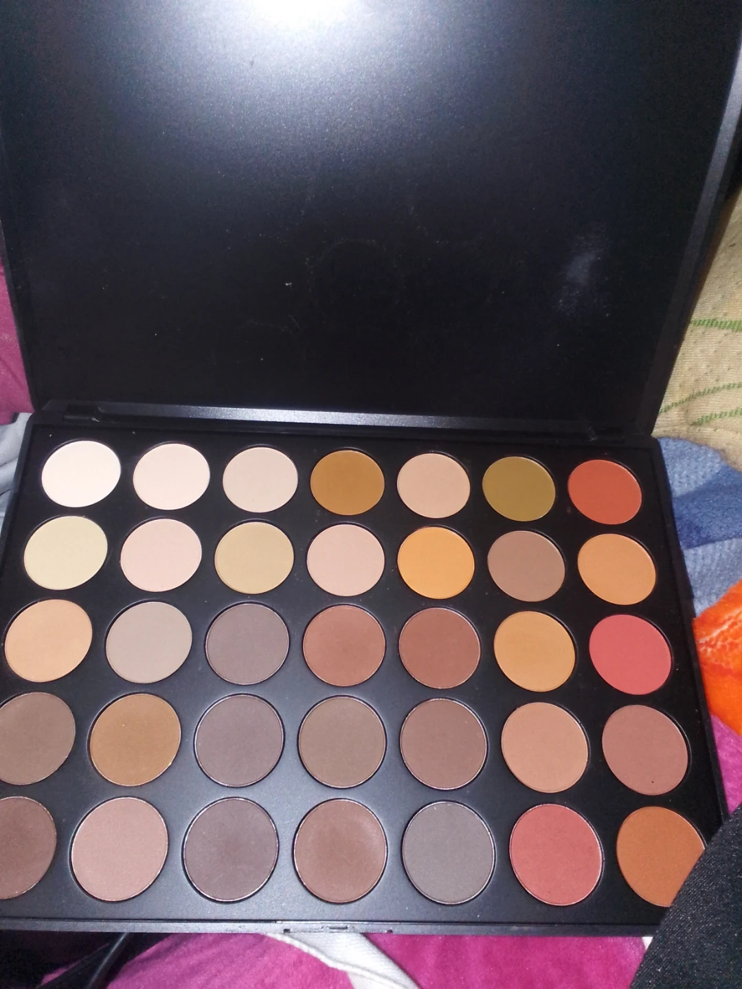 This is a Morphe eyeshadow palette with 35 shades. It contains a mix of matte and shimmer finishes. The colours are mostly neutrals and warm tones.