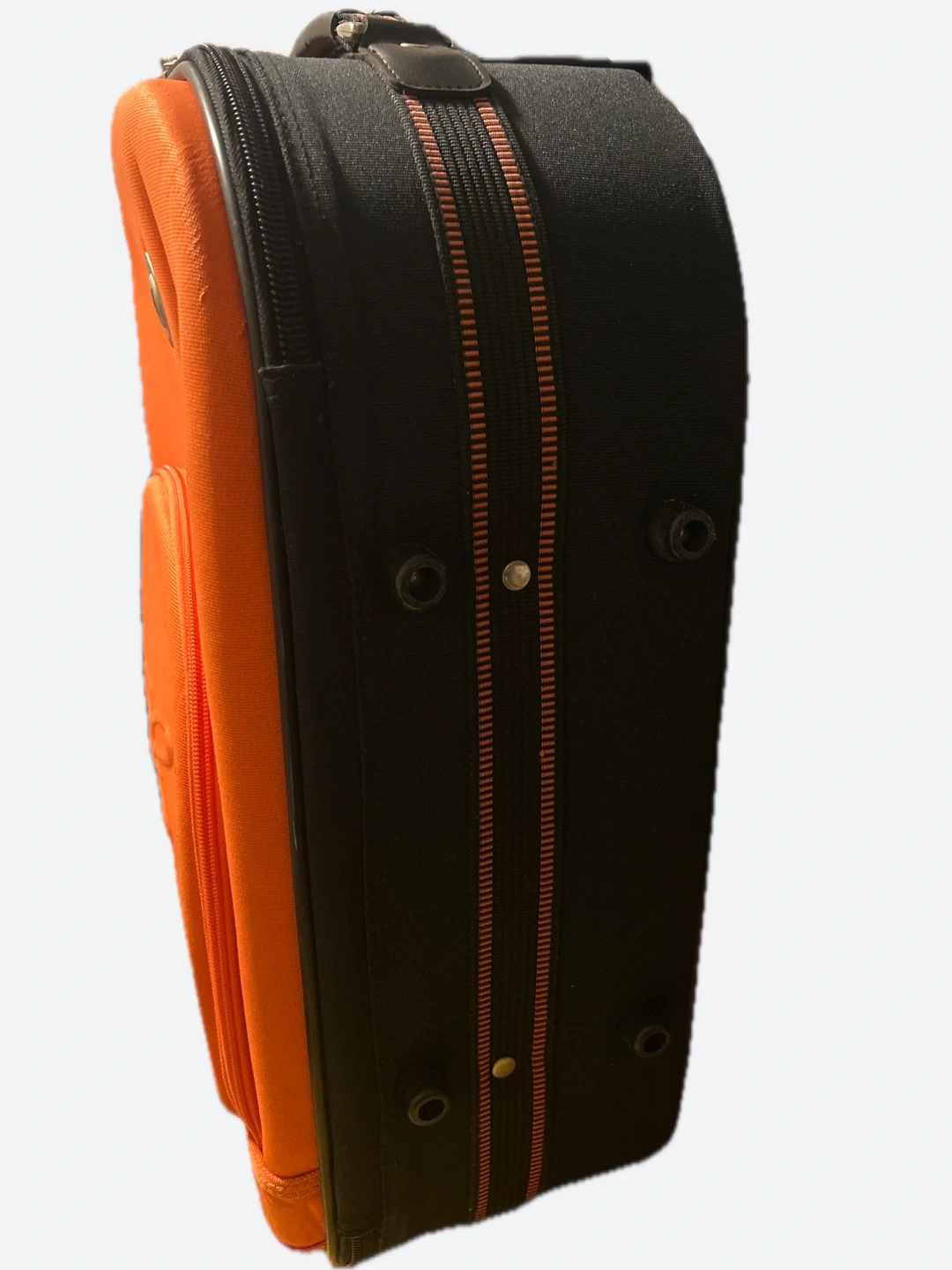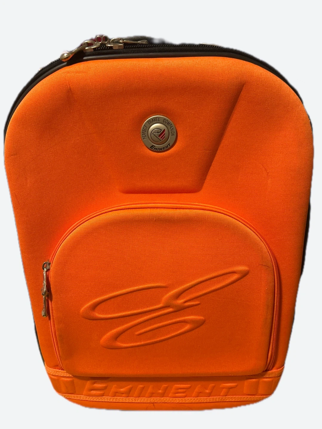 This is an orange Eminent rolling carry-on suitcase. It's made with a soft fabric exterior and features a front zippered pocket. The telescopic handle and wheels make it easy to transport your belongings on trips.