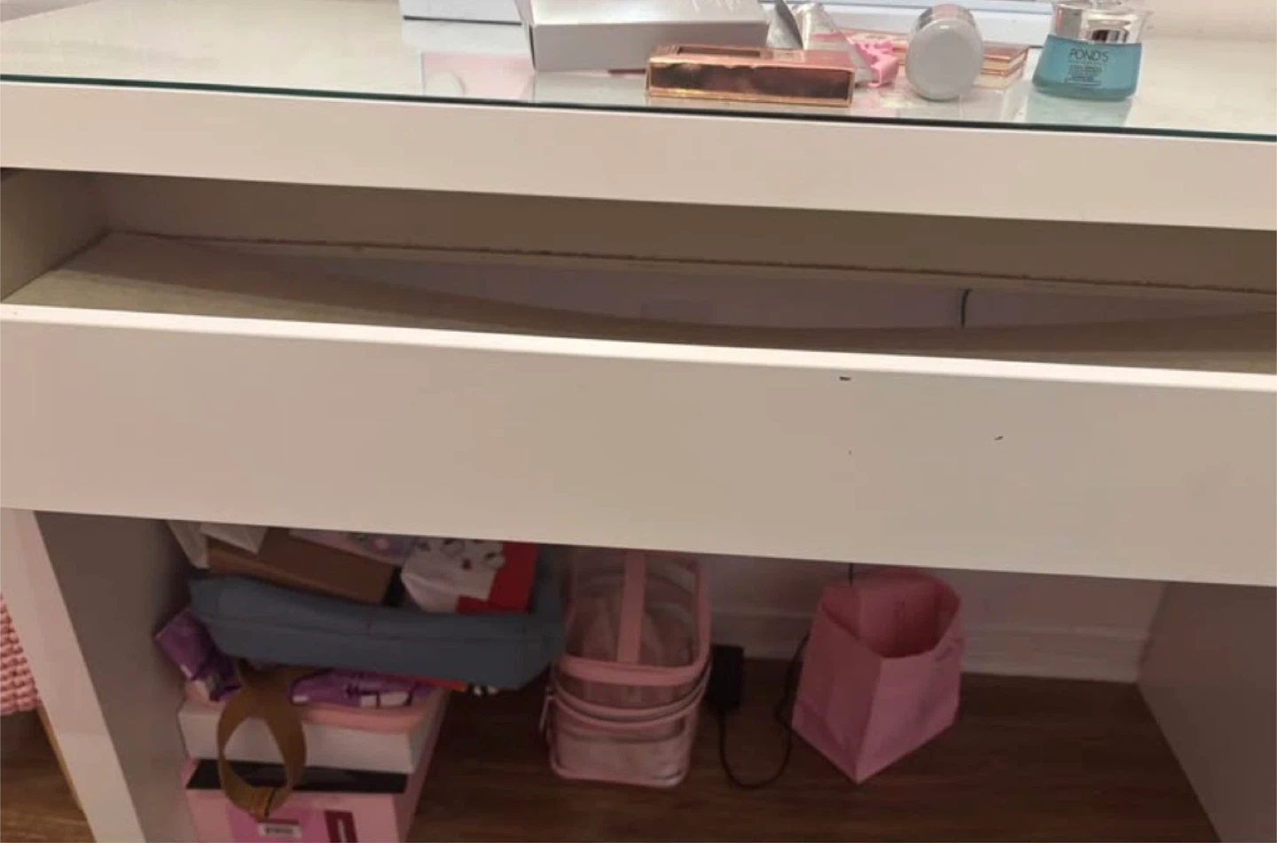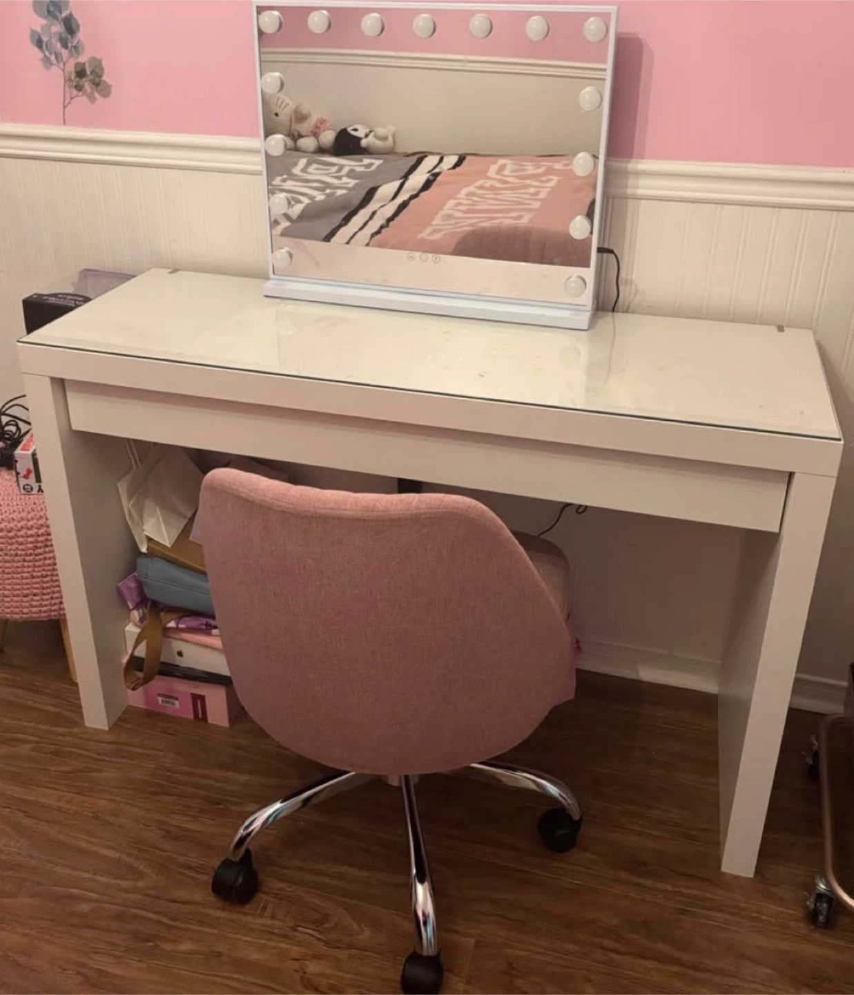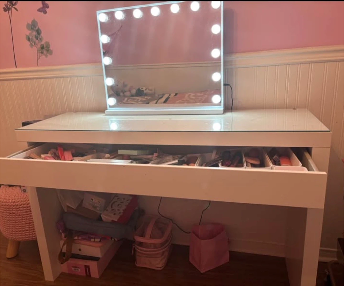 A stylish white vanity desk featuring a smooth glass top and a built-in drawer for organization. It comes with a lighted mirror, perfect for your beauty routine. This desk is great for bedrooms or dressing areas. Chair not included only vanity and mirror