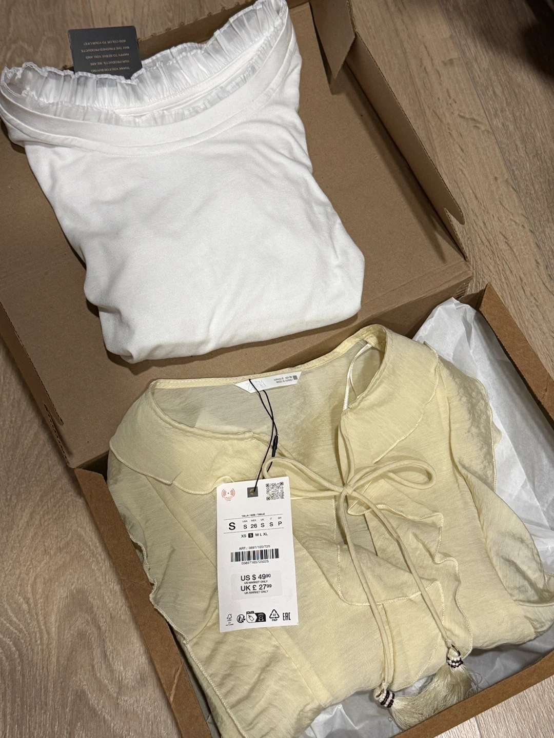 Two women's blouses. They feature a delicate ruffle neckline and a tie closure. The material is lightweight and flowy. Both size small. Perfect for layer up and down