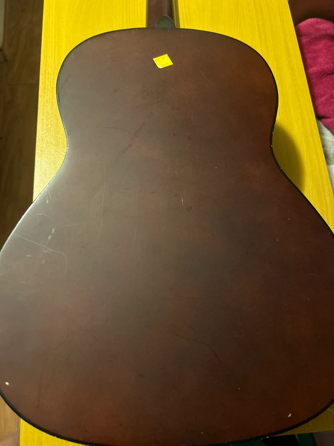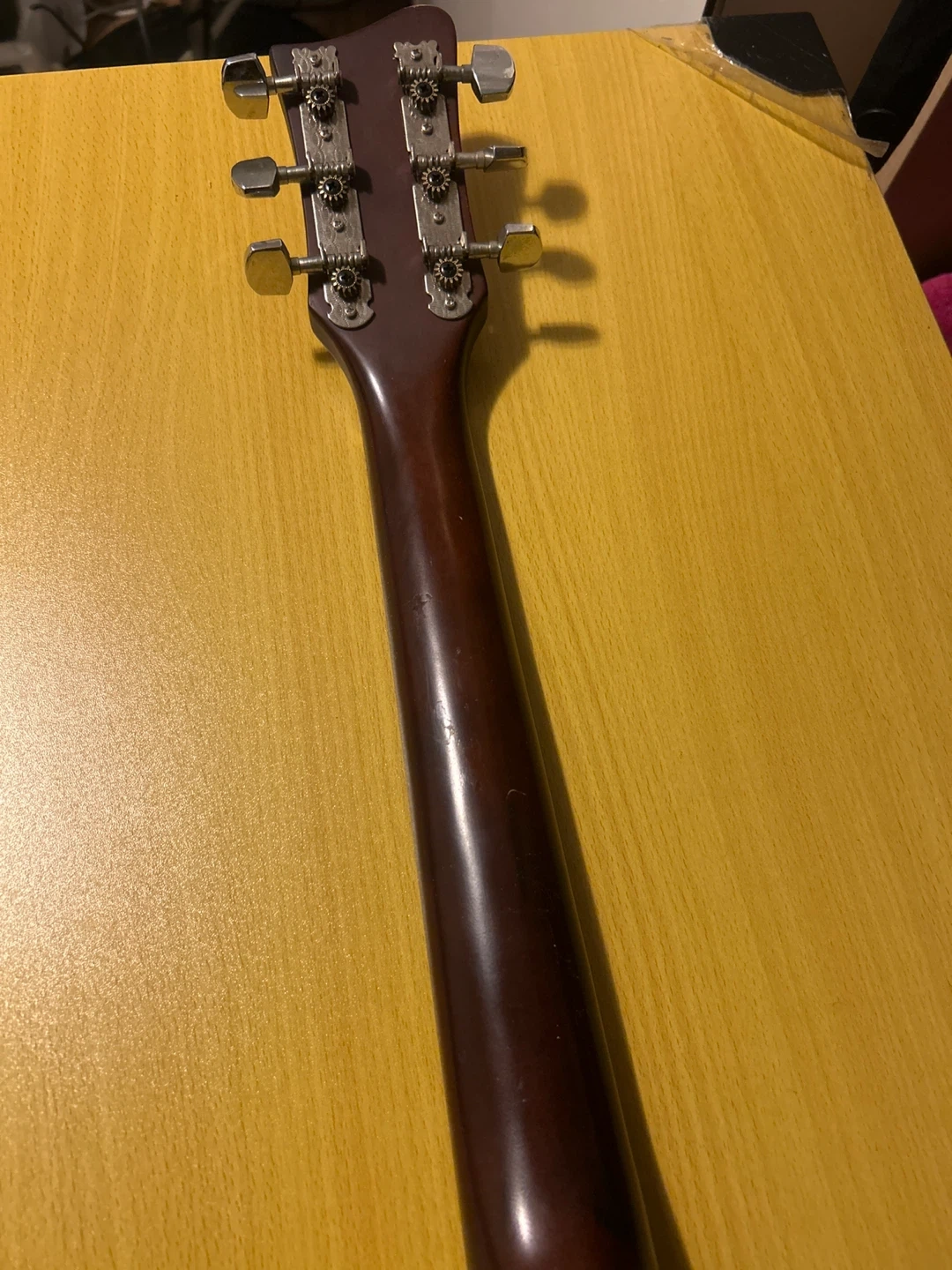 Acoustic guitar in a vibrant orange colour. It features a decorative swirl pattern on the body. Great for beginners or as a decorative piece!