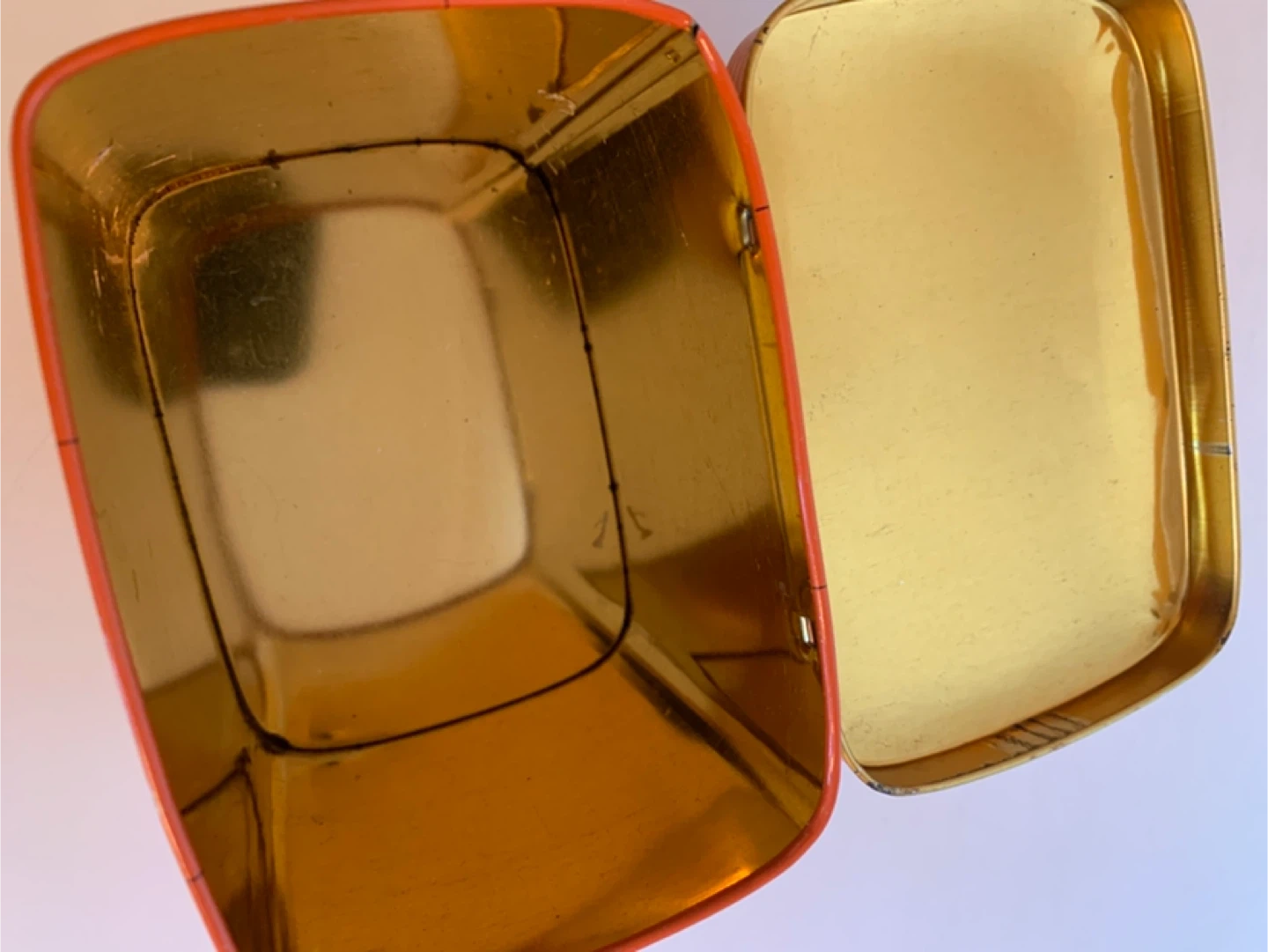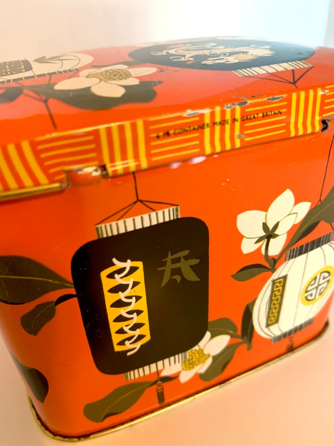 This decorative vintage tin features a vibrant orange background adorned with classic Asian motifs, including lanterns, a dragon, and floral elements. It's a lovely piece for storage or display. The tin has a hinged lid and a metallic gold interior.