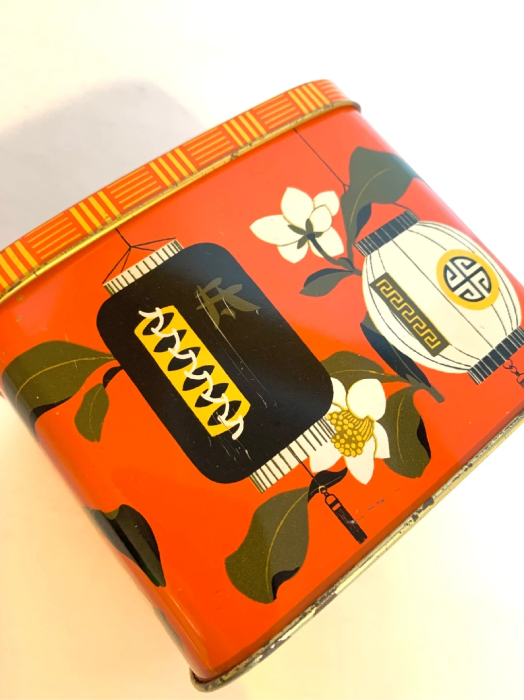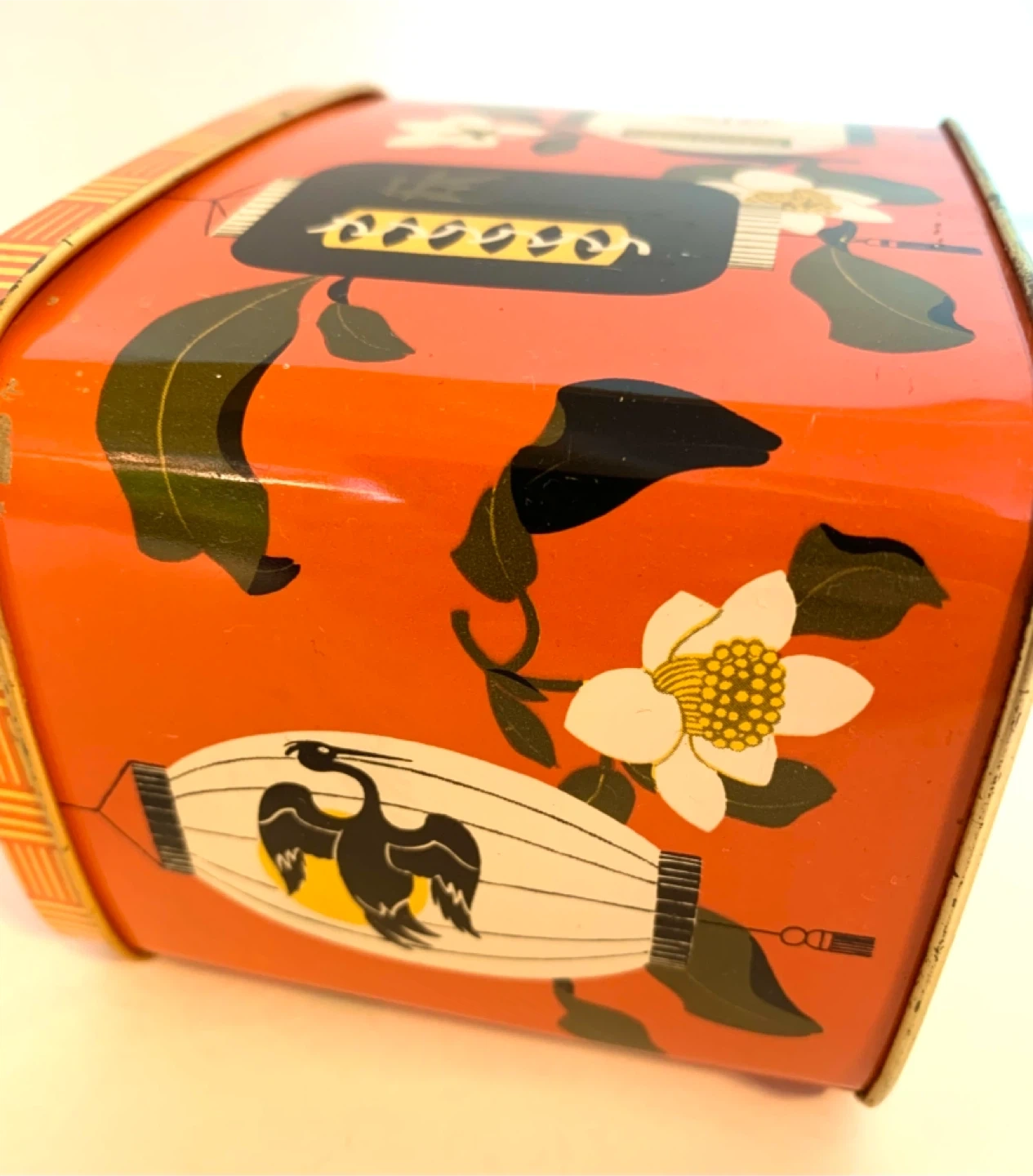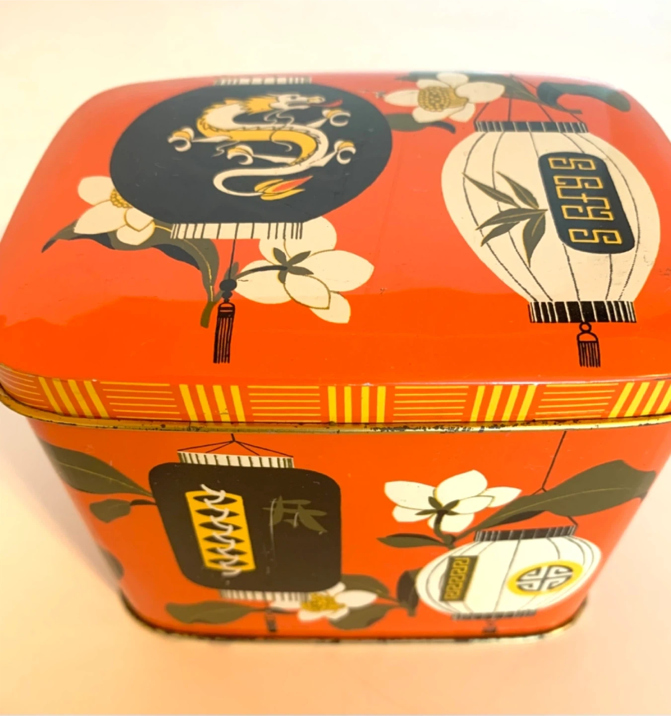 This decorative vintage tin features a vibrant orange background adorned with classic Asian motifs, including lanterns, a dragon, and floral elements. It's a lovely piece for storage or display. The tin has a hinged lid and a metallic gold interior.