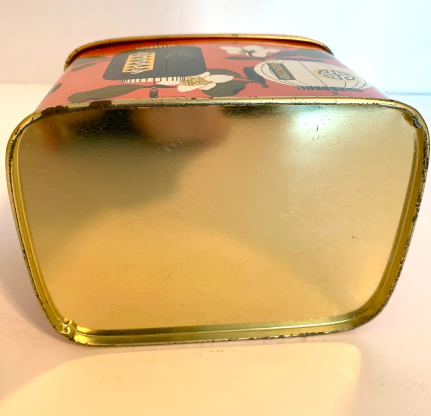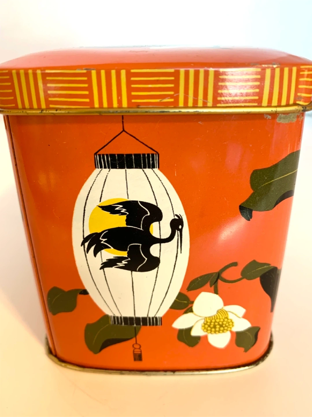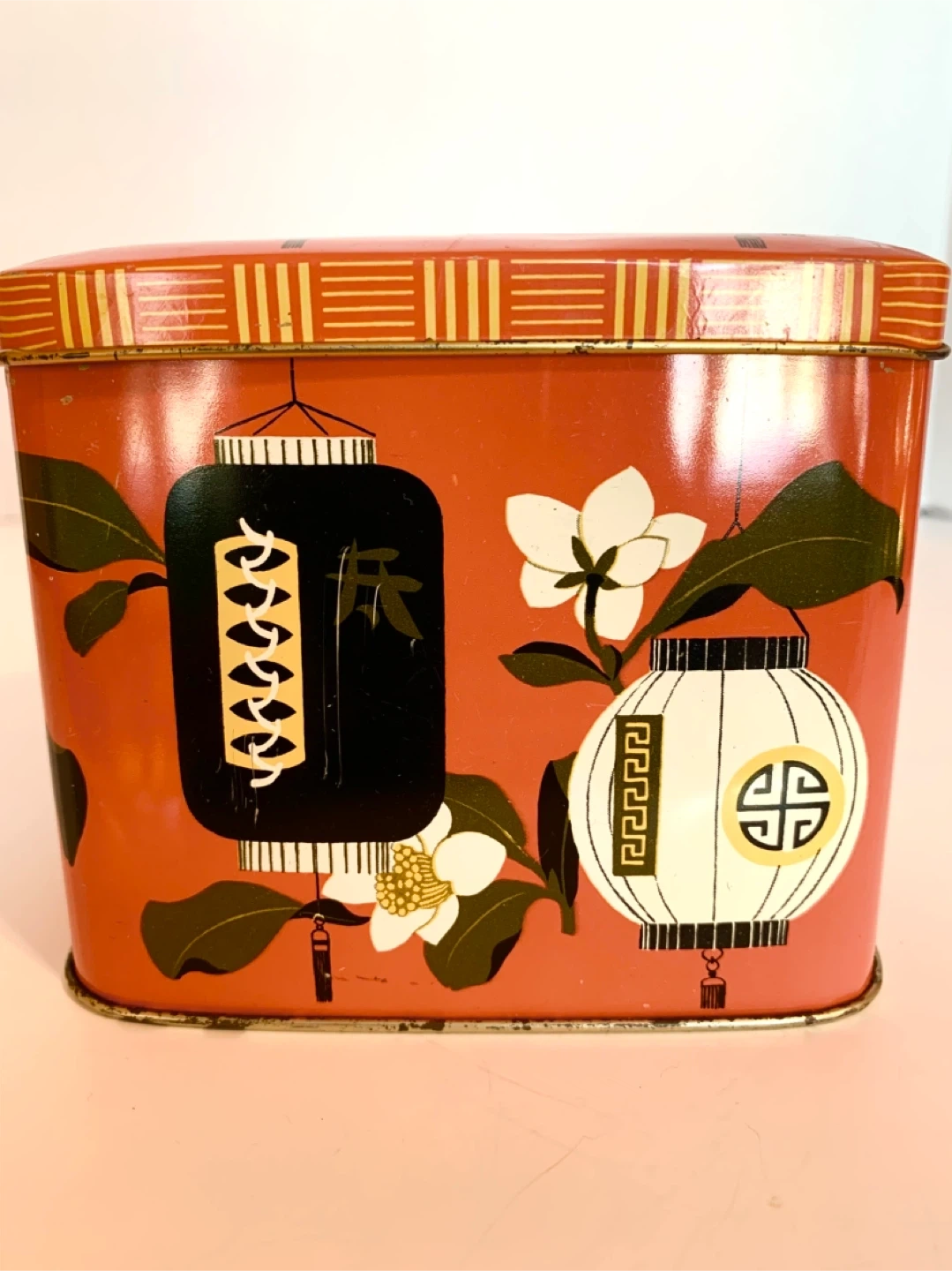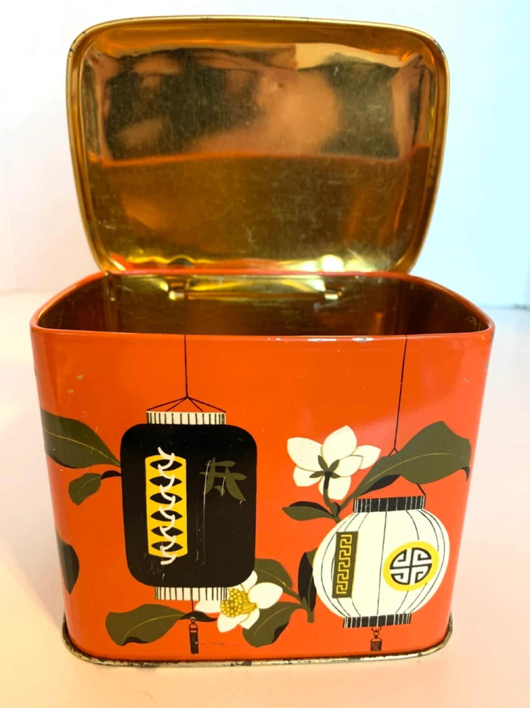 This decorative vintage tin features a vibrant orange background adorned with classic Asian motifs, including lanterns, a dragon, and floral elements. It's a lovely piece for storage or display. The tin has a hinged lid and a metallic gold interior.