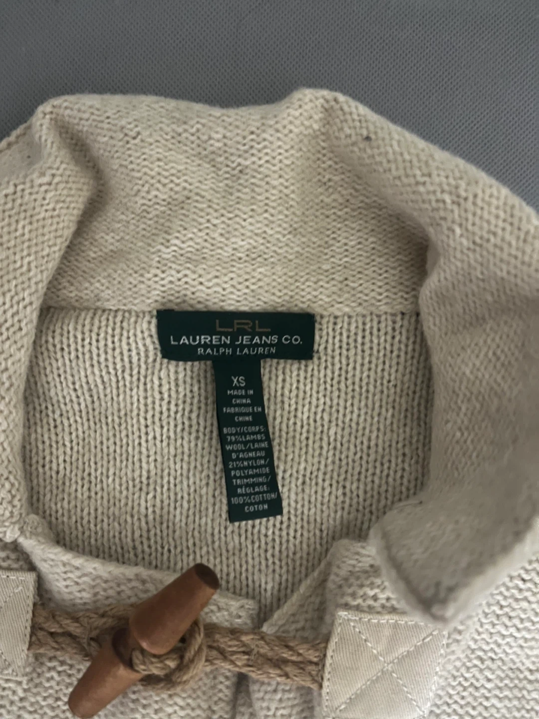 A Ralph Lauren cardigan with toggle closure and navy stripes. Made of 100% cotton. Size XS.