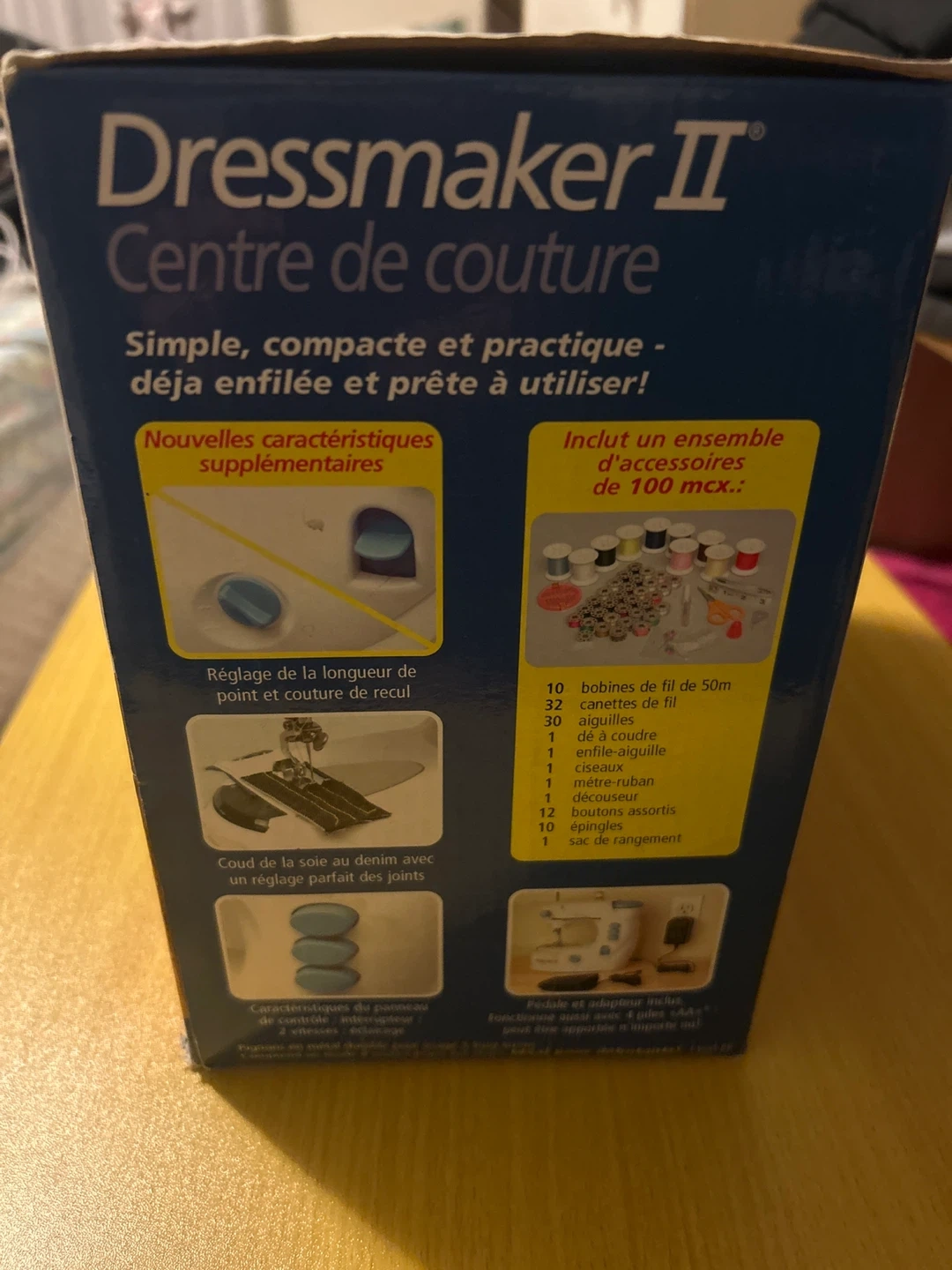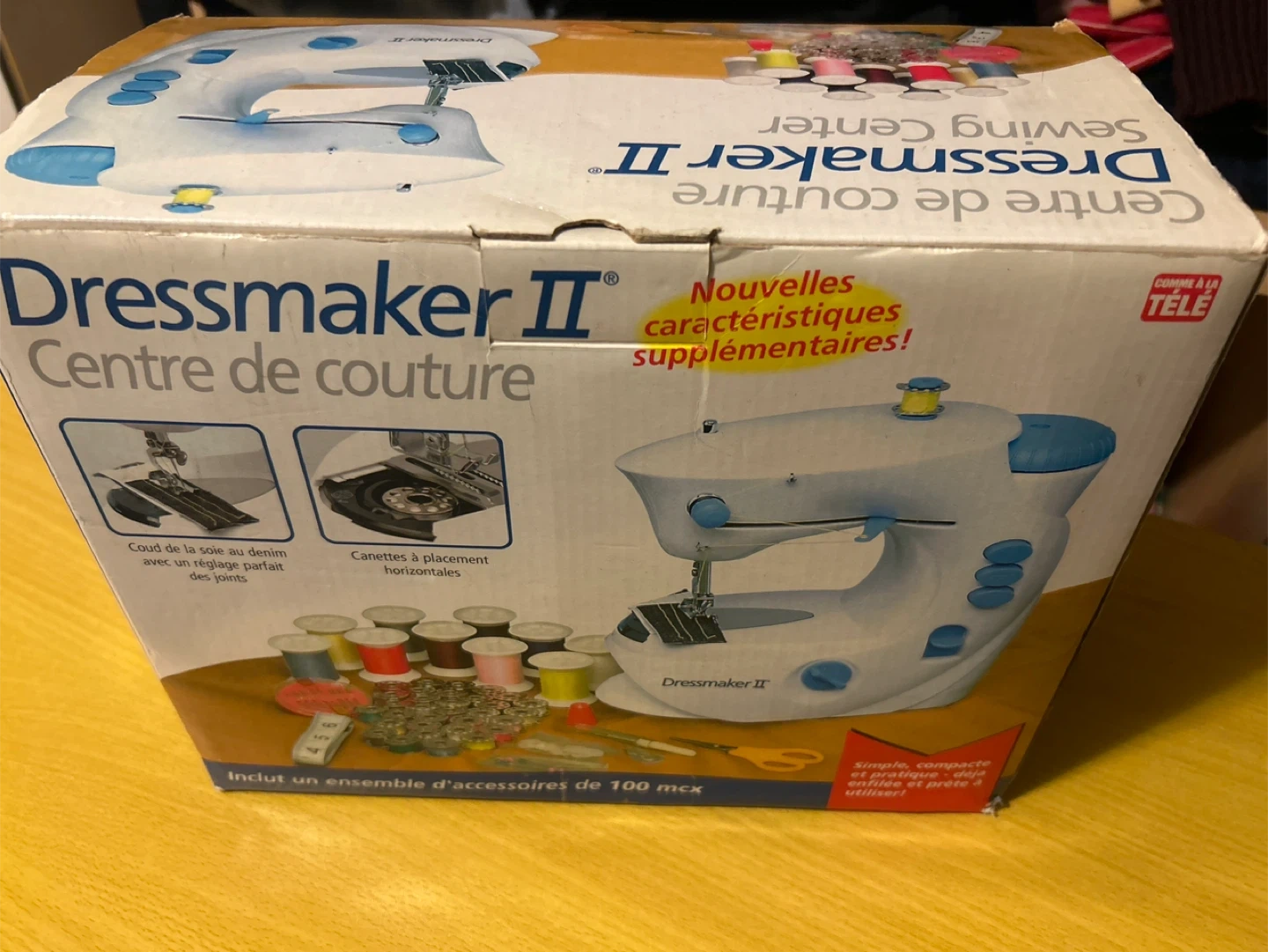 This is a Dressmaker II sewing machine. It includes a set of 100 accessories, such as spools of thread and needles. It's simple, compact, and practical, ready to use!