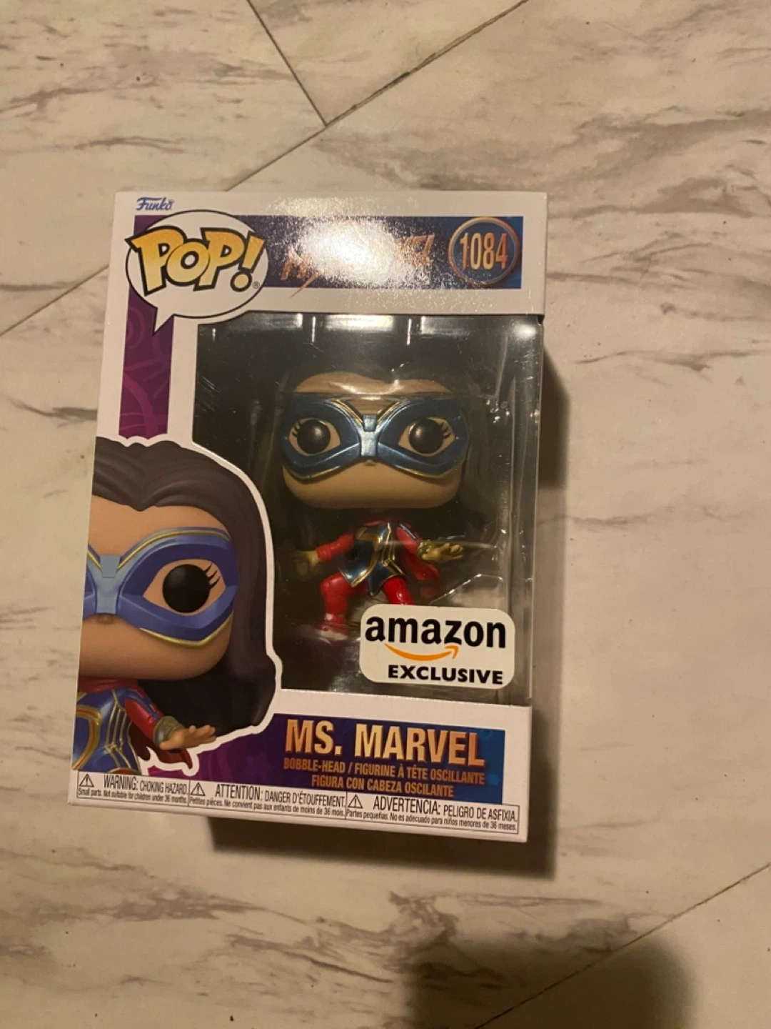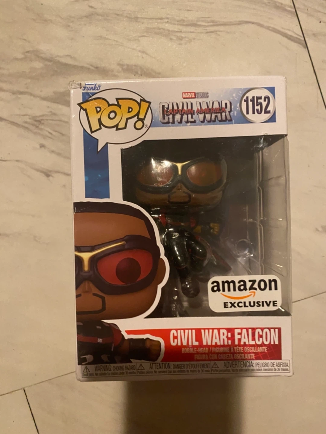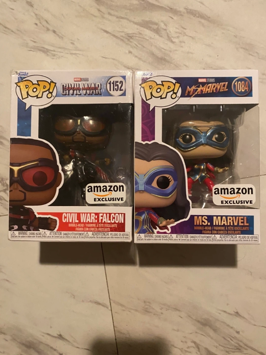 Two Funko Pop! figures, Civil War Falcon #1152 and Ms. Marvel #1084. Both are Amazon exclusives and come in their original boxes. These bobbleheads are great for any Marvel collector.