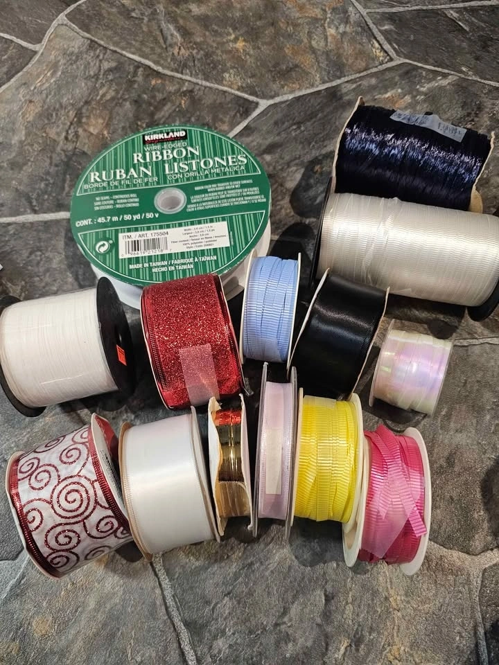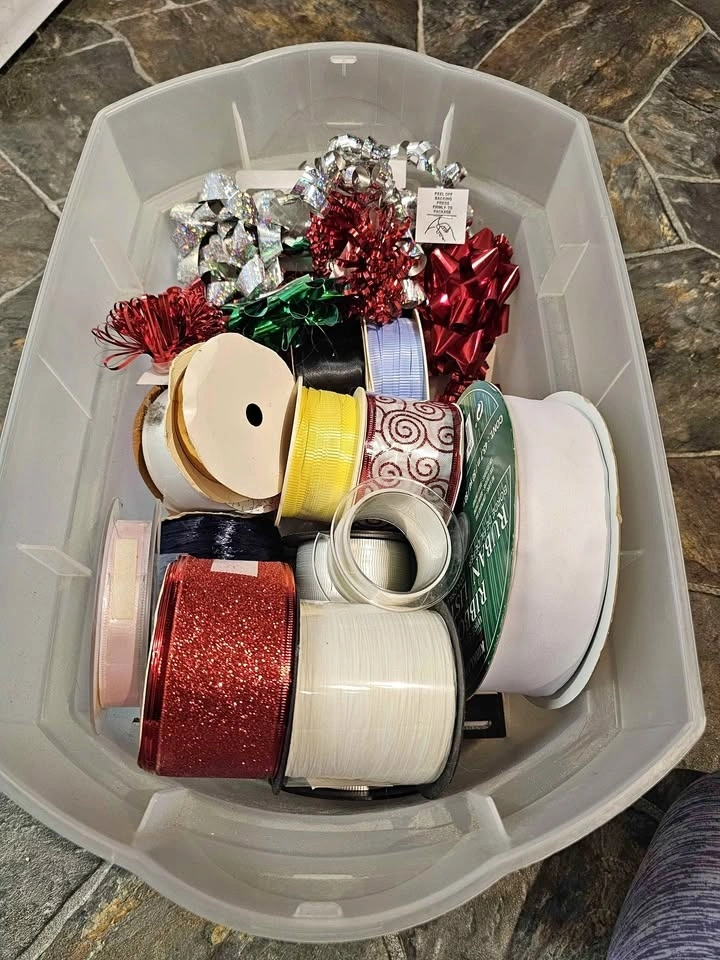 Includes a variety of greeting cards for occasions like Valentine's Day, Christmas, and birthdays, plus miscellaneous cards. Also contains unused bows with backing still attached and assorted ribbons.