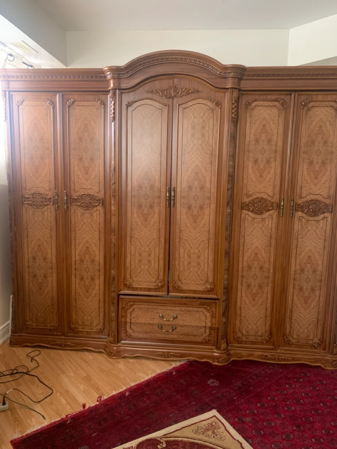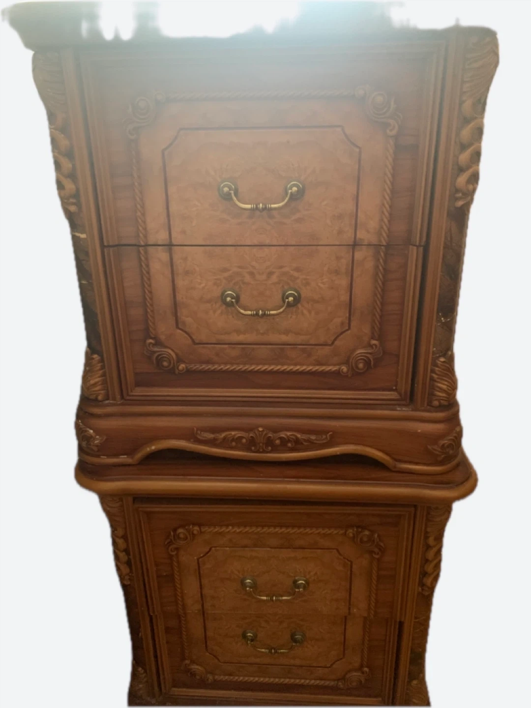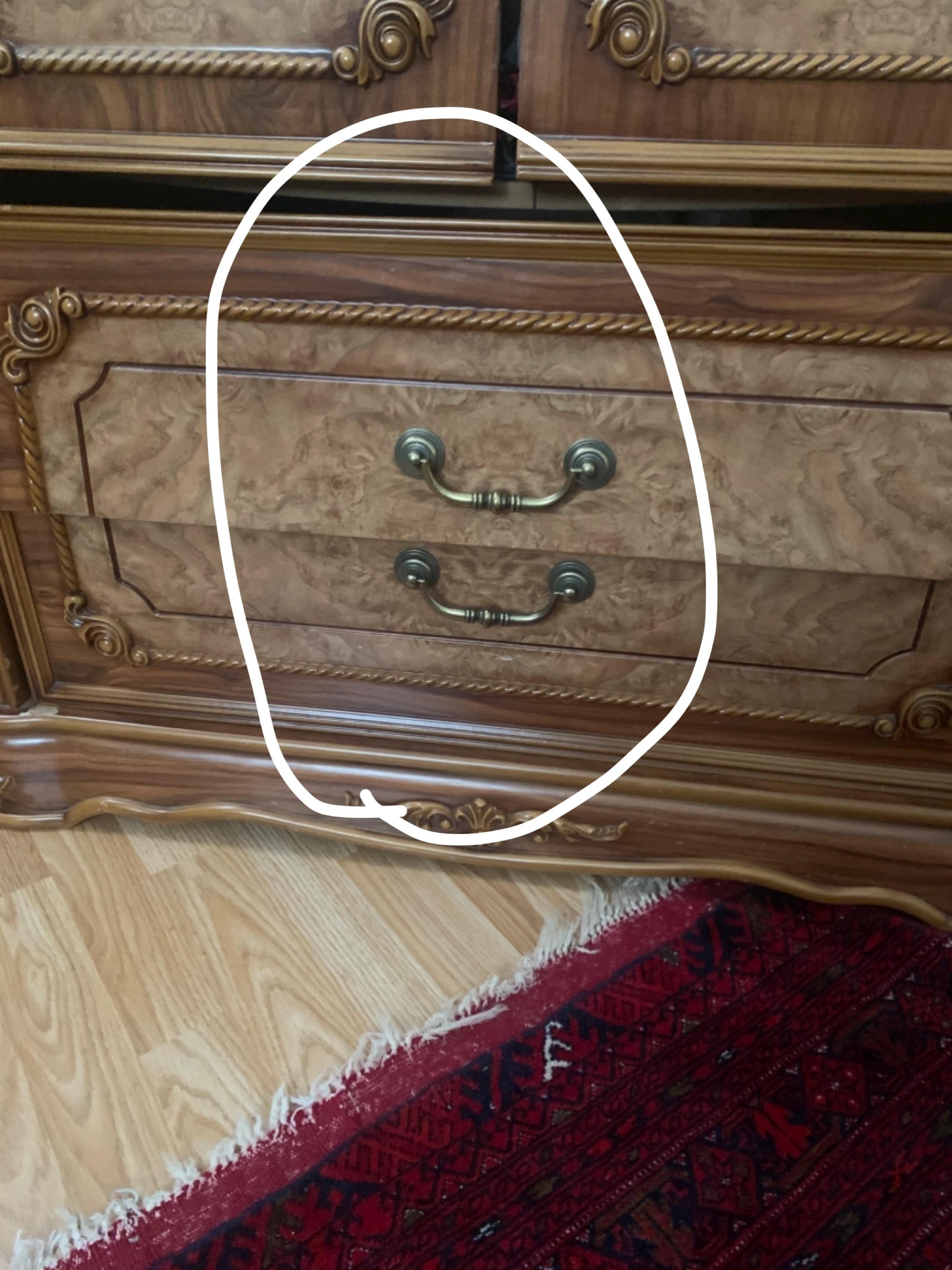 This dresser features a beautiful wood grain finish with decorative carvings and antique brass handles. It has multiple drawers for storage. This piece adds a classic touch to any bedroom just the big drawer is not closeing properly