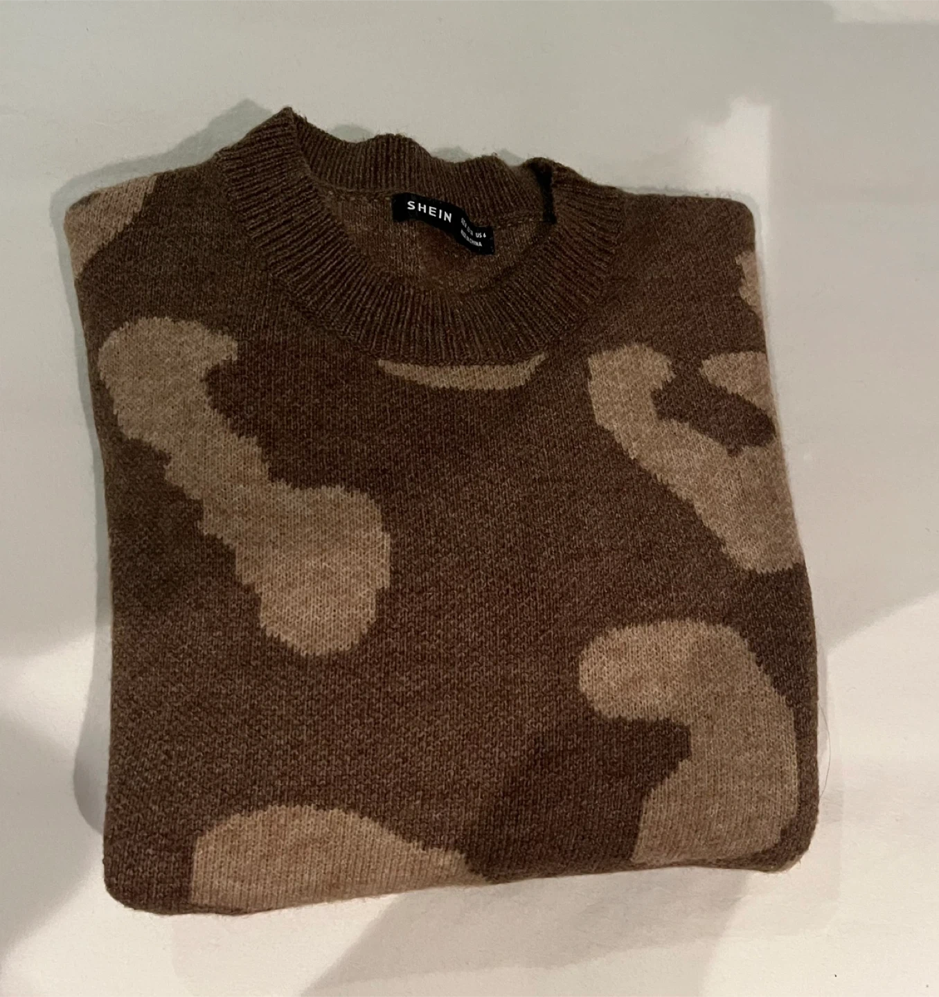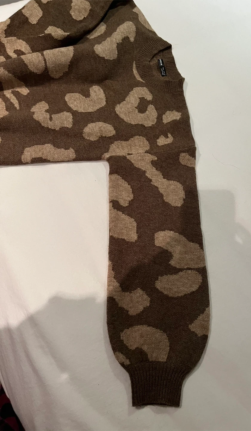 This brand new SHEIN sweater features a trendy leopard print design in brown and beige. It's a size medium and made from 100% acrylic for a cozy feel. Has lantern sleeves. Never been worn.