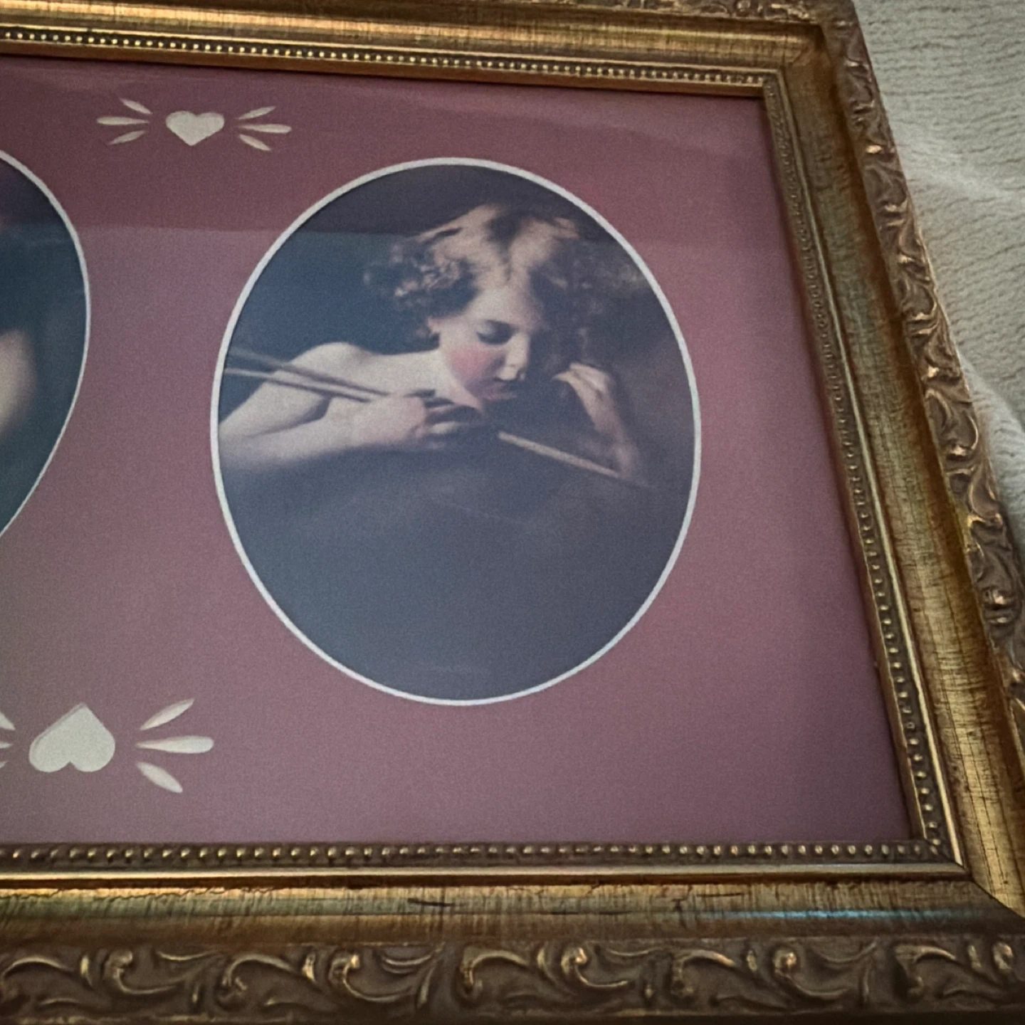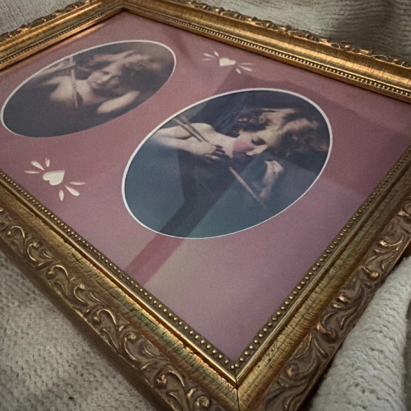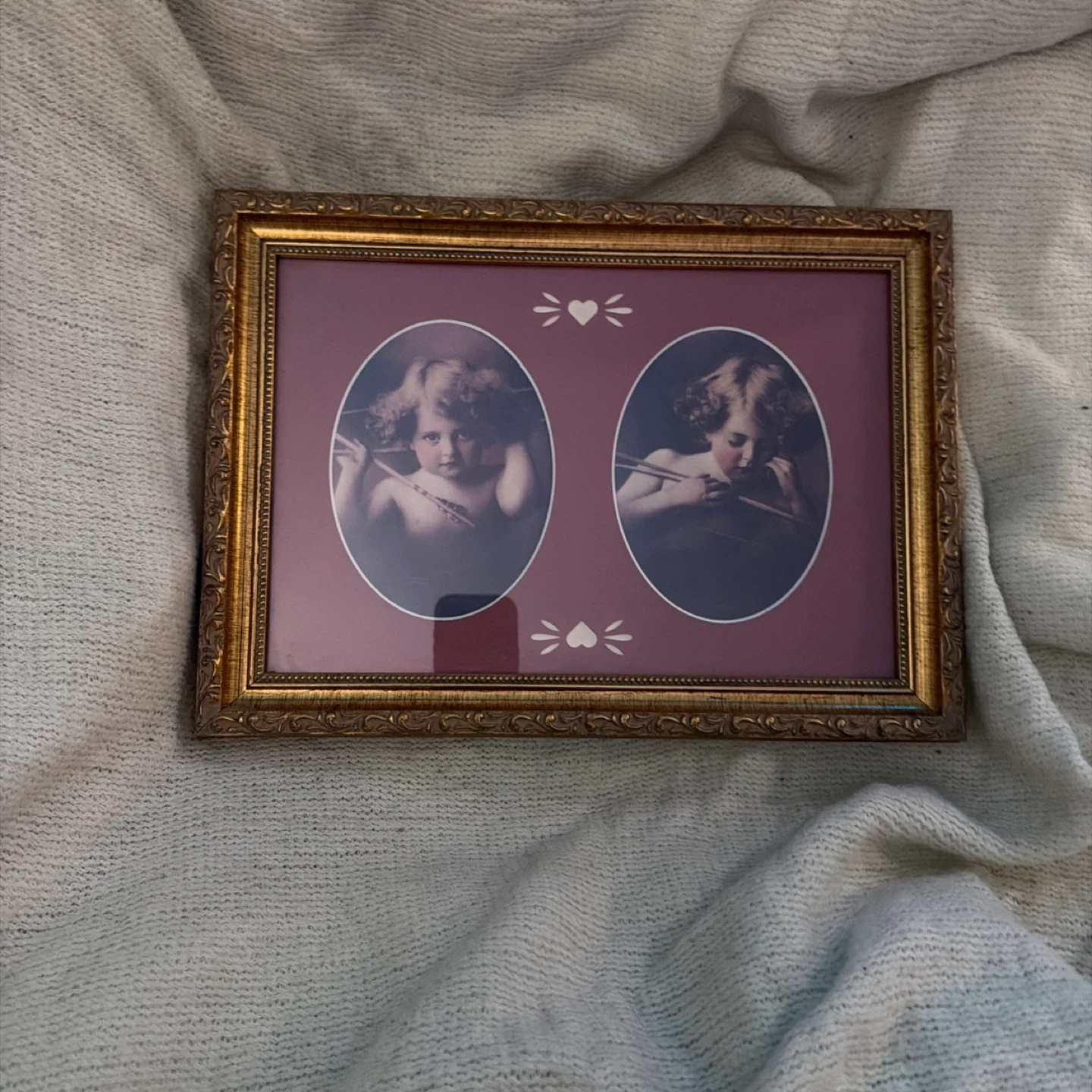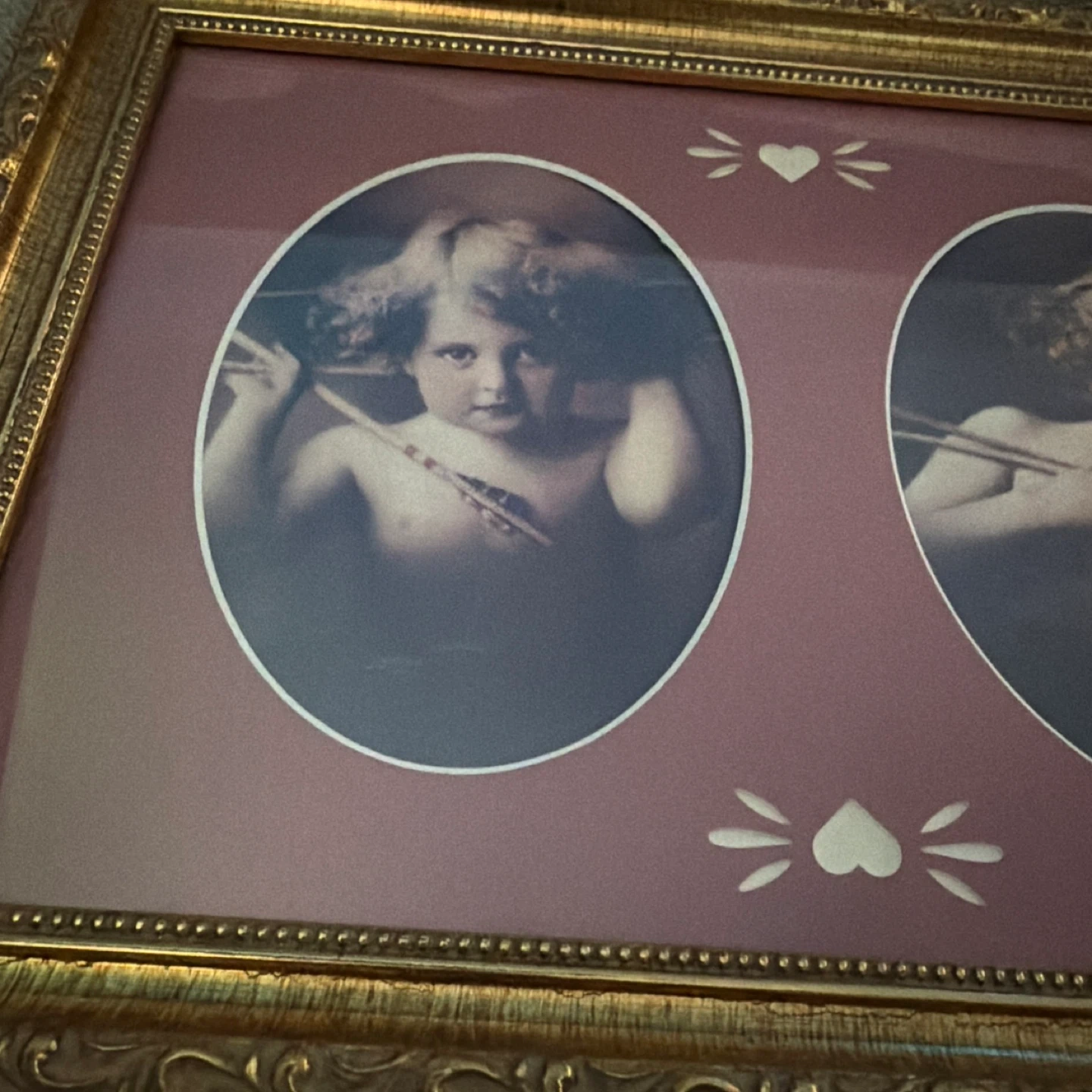 This vintage picture frame features a decorative gold-tone ornate frame. It holds two oval images of cherubic figures, with a charming maroon matting and heart accents. The back includes a label with manufacturer information.