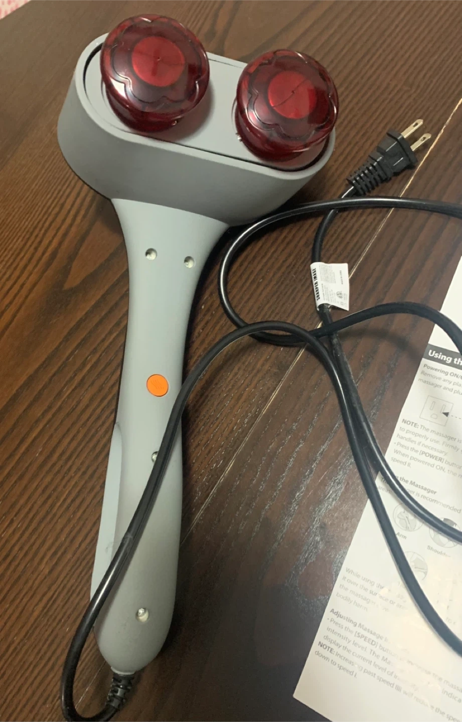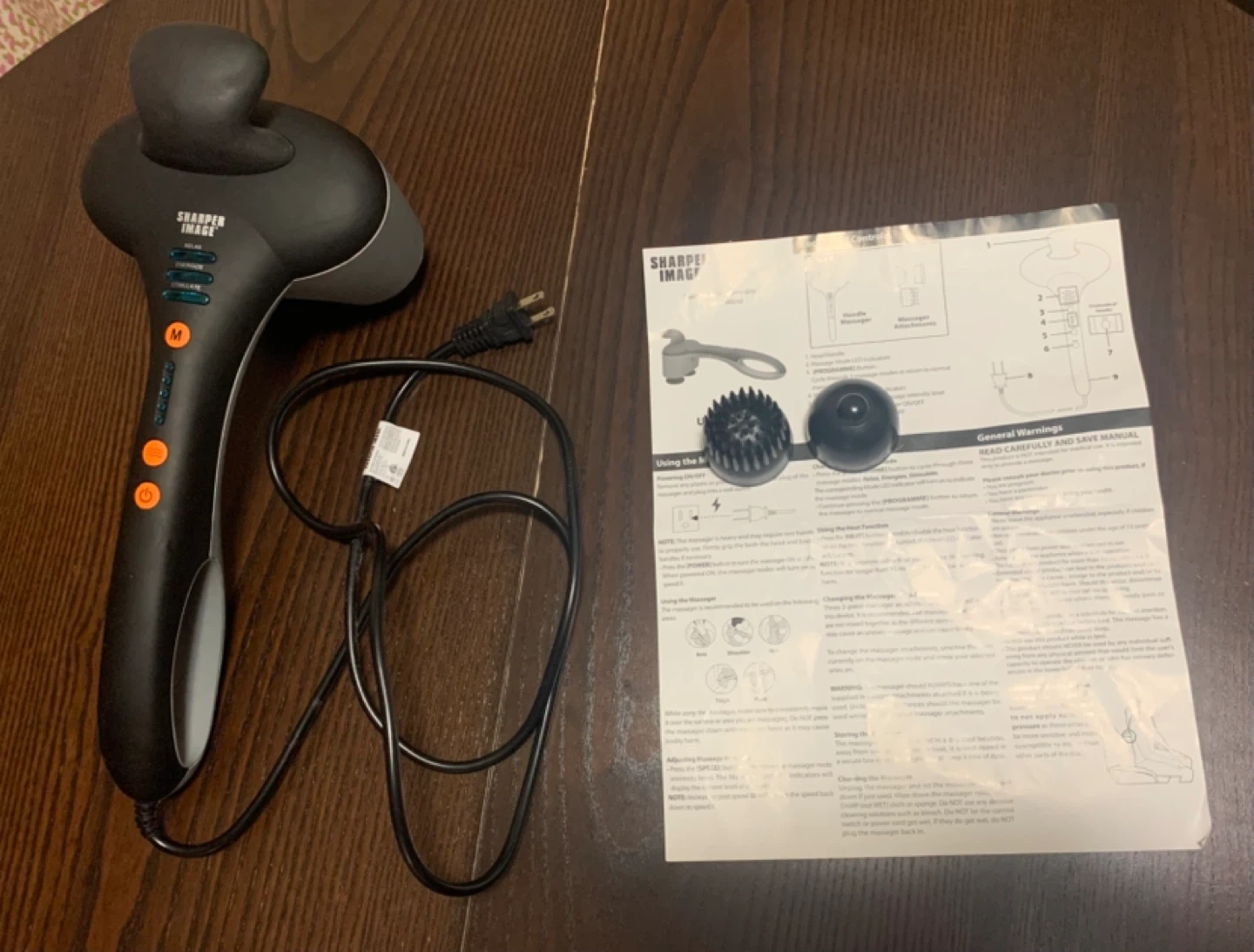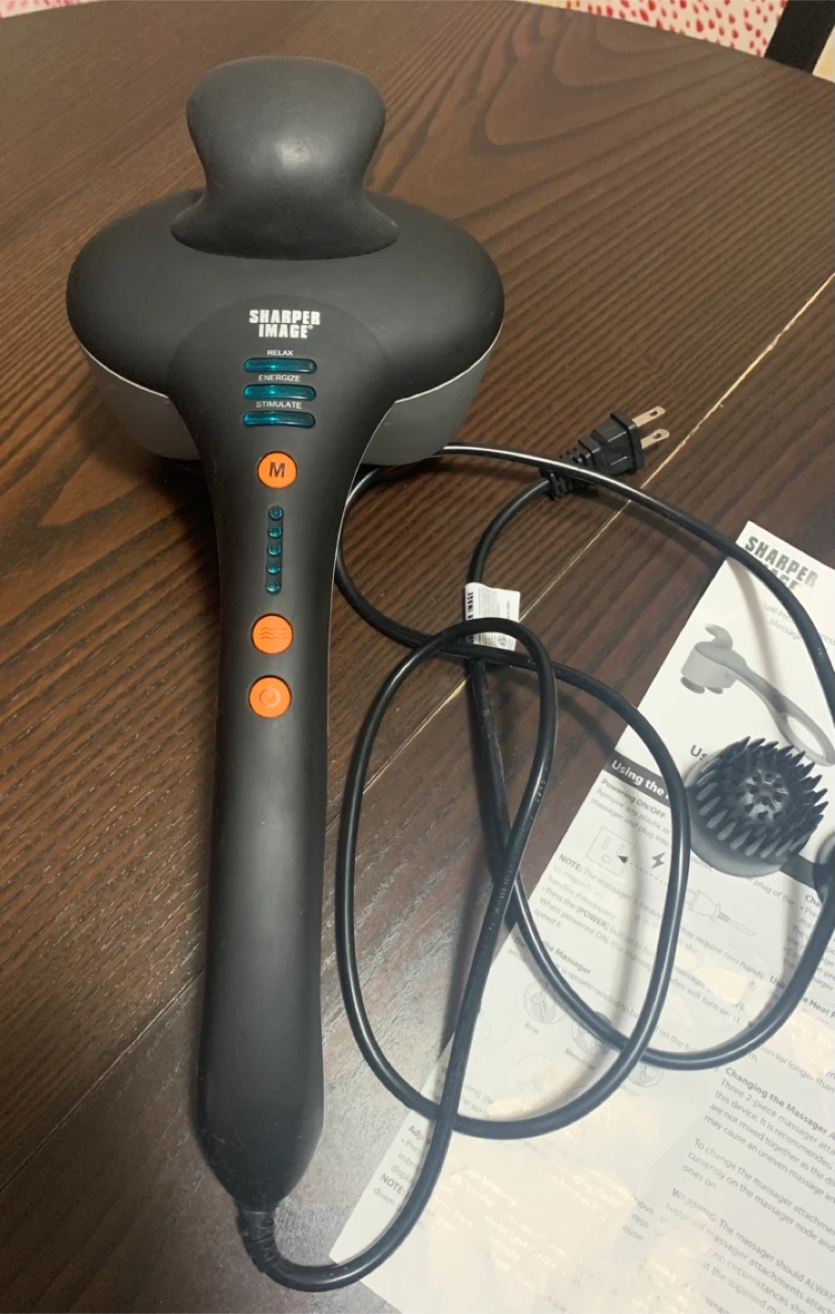 This Sharper Image handheld massager comes with multiple attachments and settings for relaxation and massage. It features different modes and intensities for a customized experience. Includes the instruction manual.