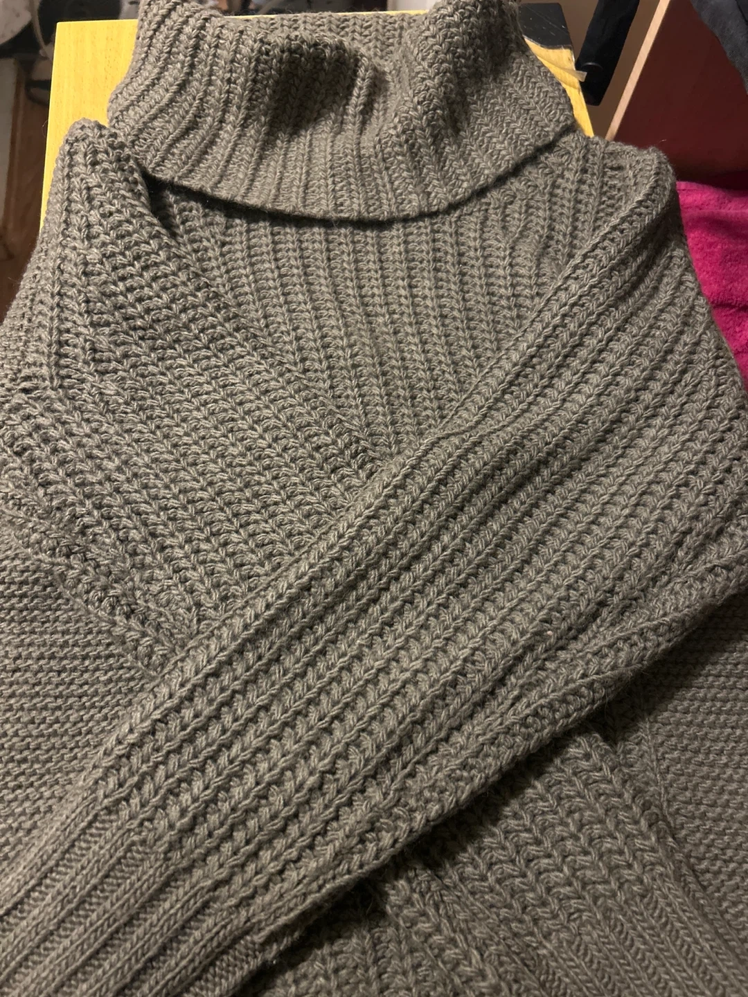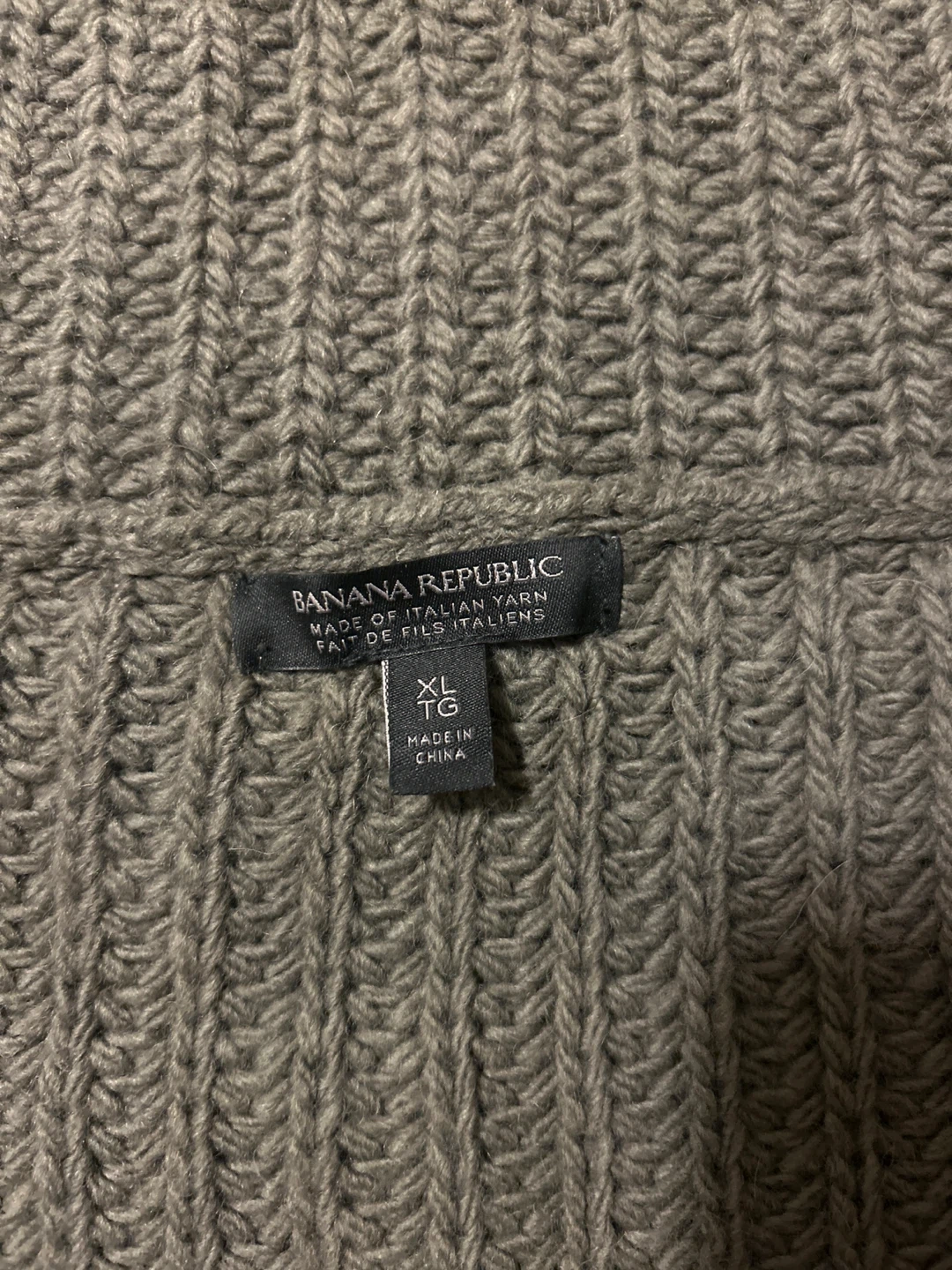 This Banana Republic sweater is made of Italian yarn. It's a chunky knit turtleneck in size XL. It's made in China. A warm addition for cooler weather!