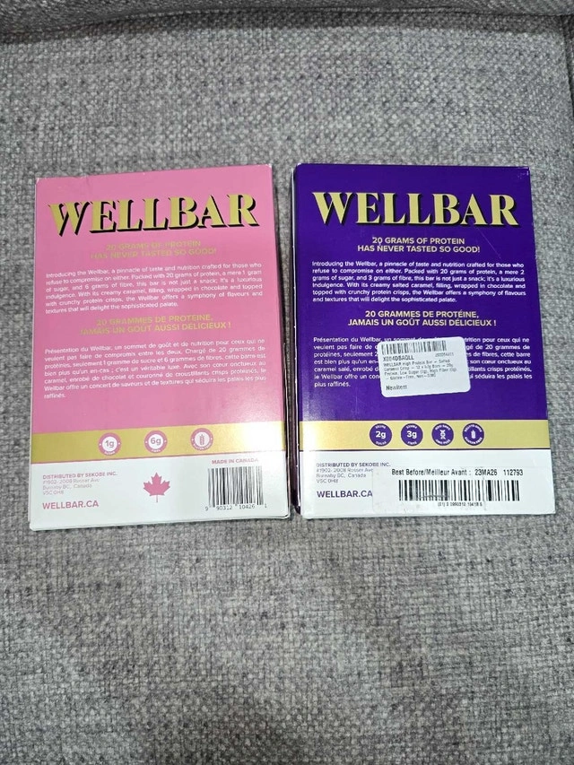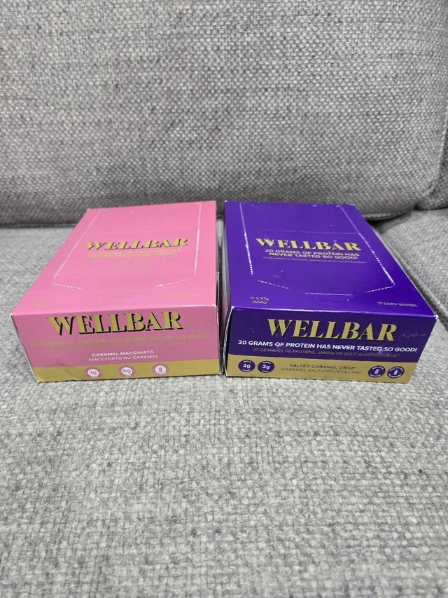 Selling two boxes of Wellbar protein bars, Caramel Macchiato & Salted Caramel Crisp flavors. Each box has 11 bars (one of each flavor is missing). Expiry dates are May and October. Pickup in the Fischer Hallman & Bleams area. $60 for both.