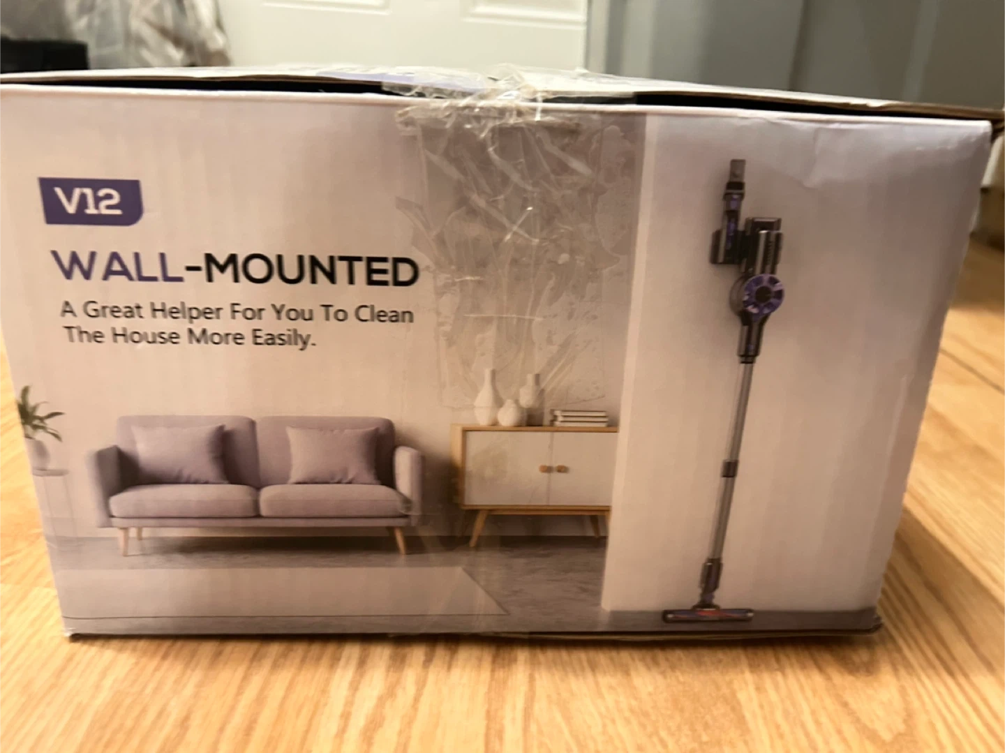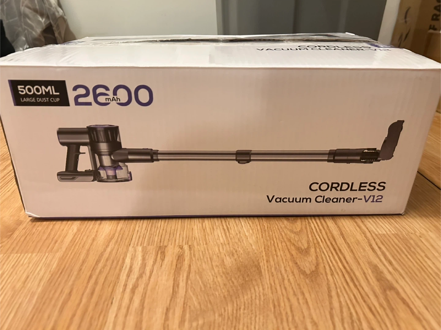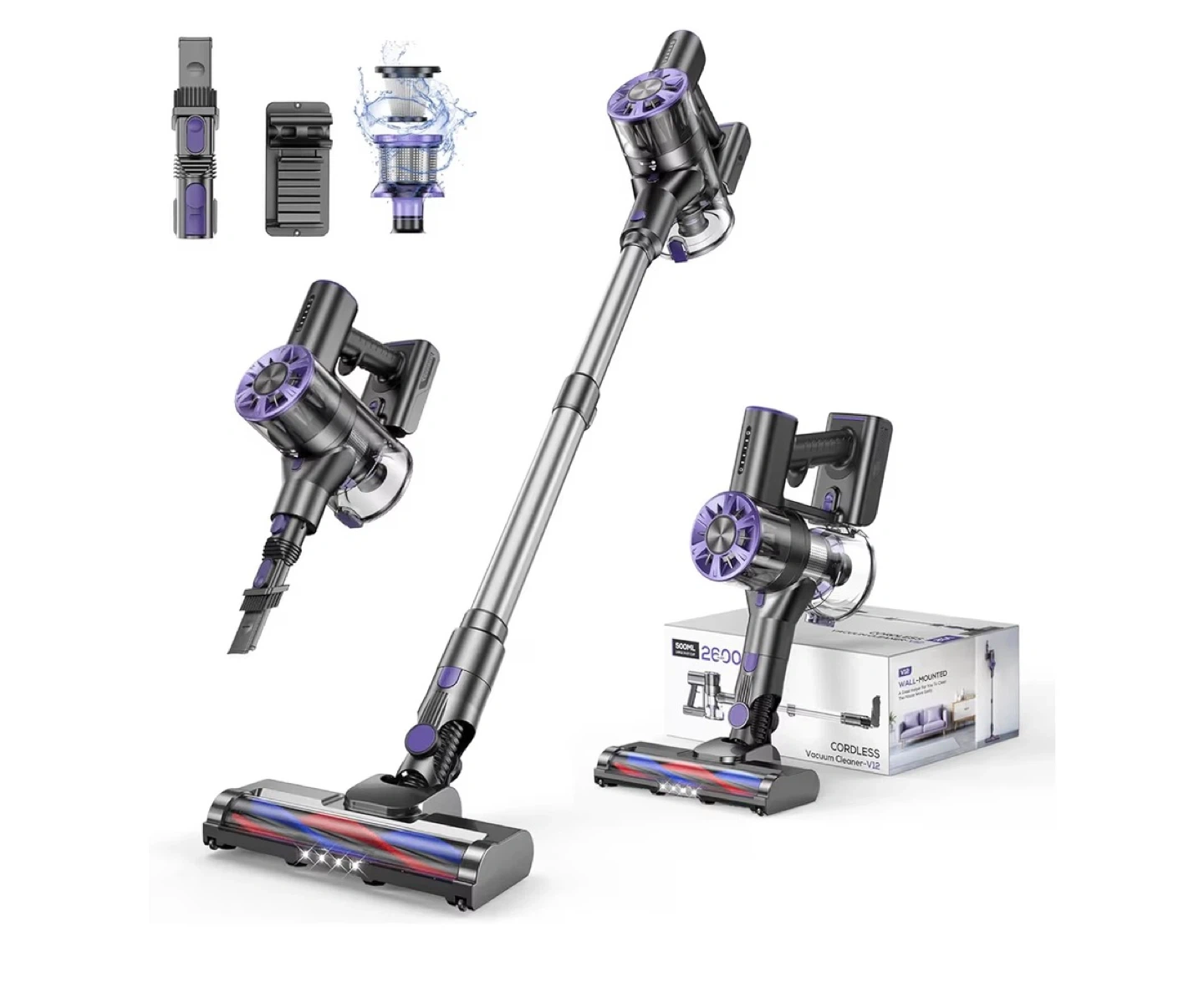 This V12 cordless vacuum cleaner is designed for efficient house cleaning. It features a 500ml large dust cup and a 2600mAh battery for extended use. The unit comes with a wall-mount accessory for convenient storage. It's great for quick cleanups around the house!
