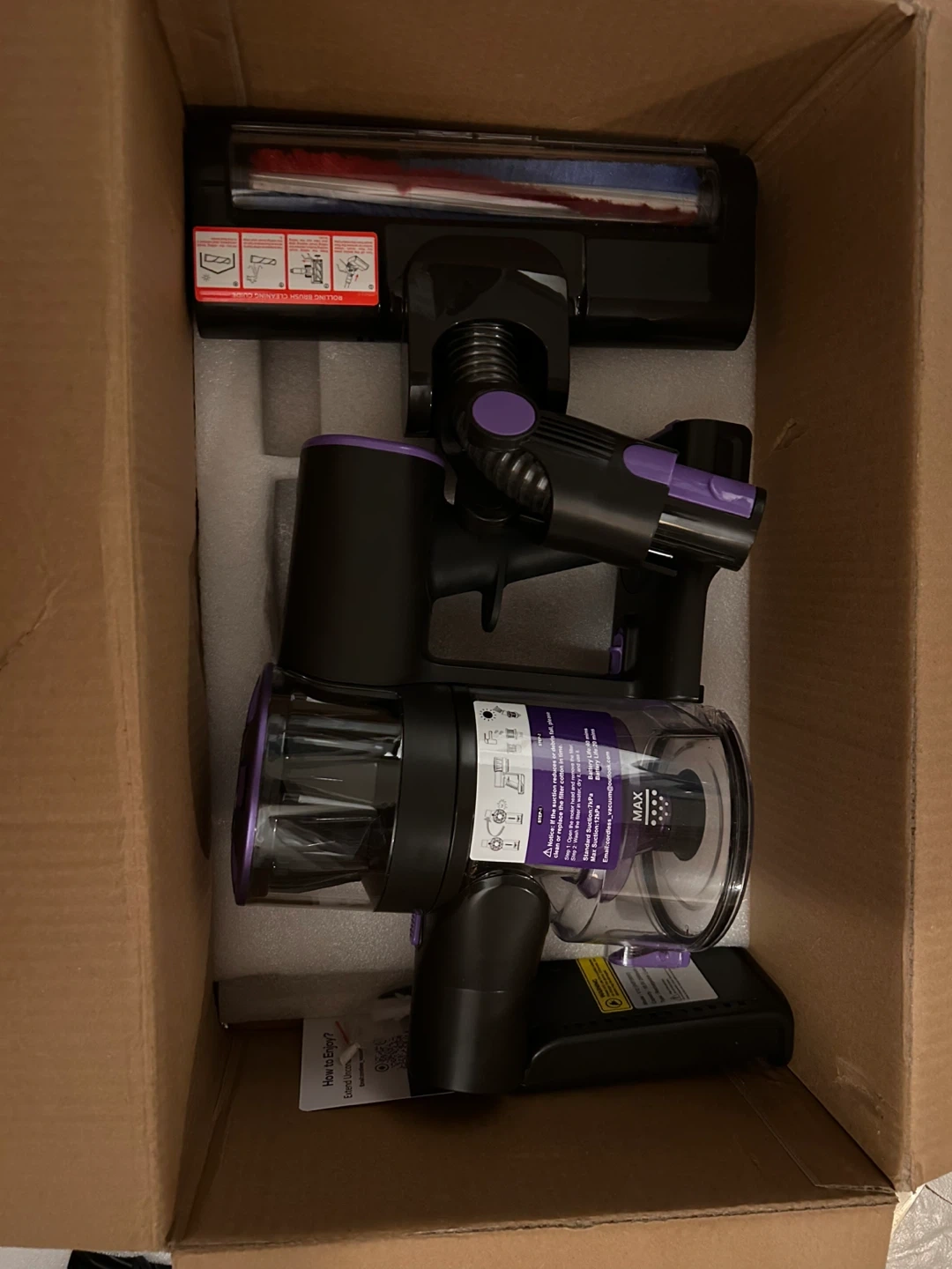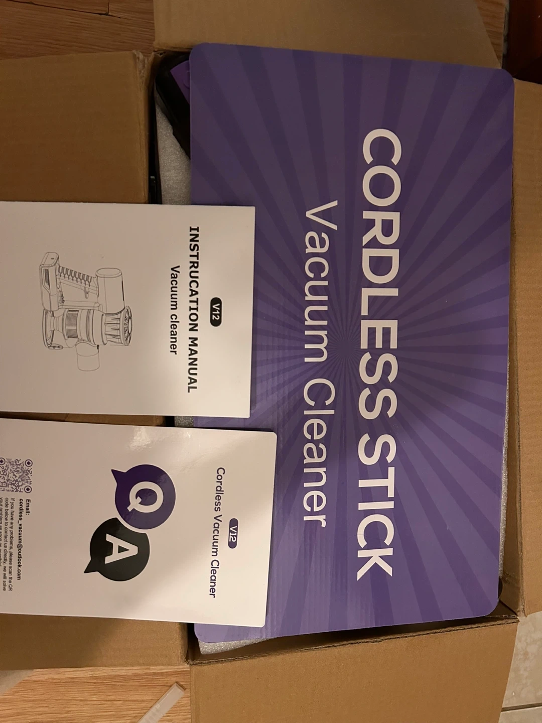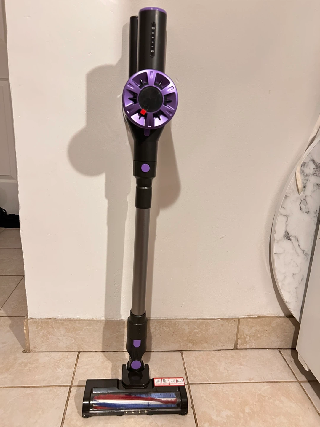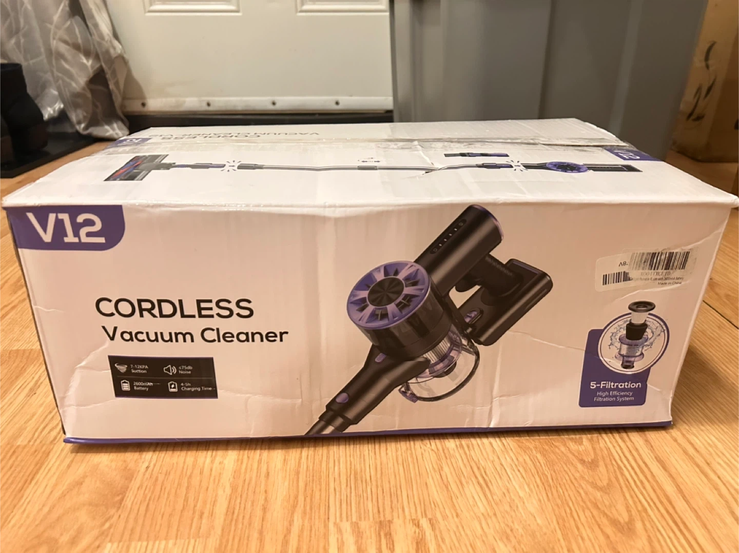This V12 cordless vacuum cleaner is designed for efficient house cleaning. It features a 500ml large dust cup and a 2600mAh battery for extended use. The unit comes with a wall-mount accessory for convenient storage. It's great for quick cleanups around the house!