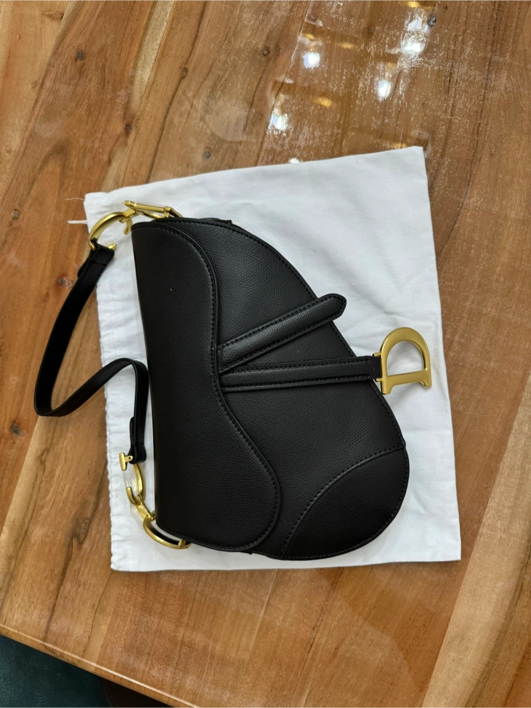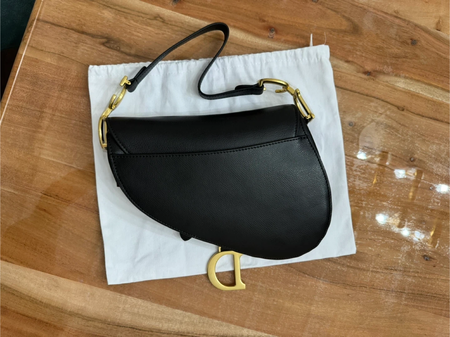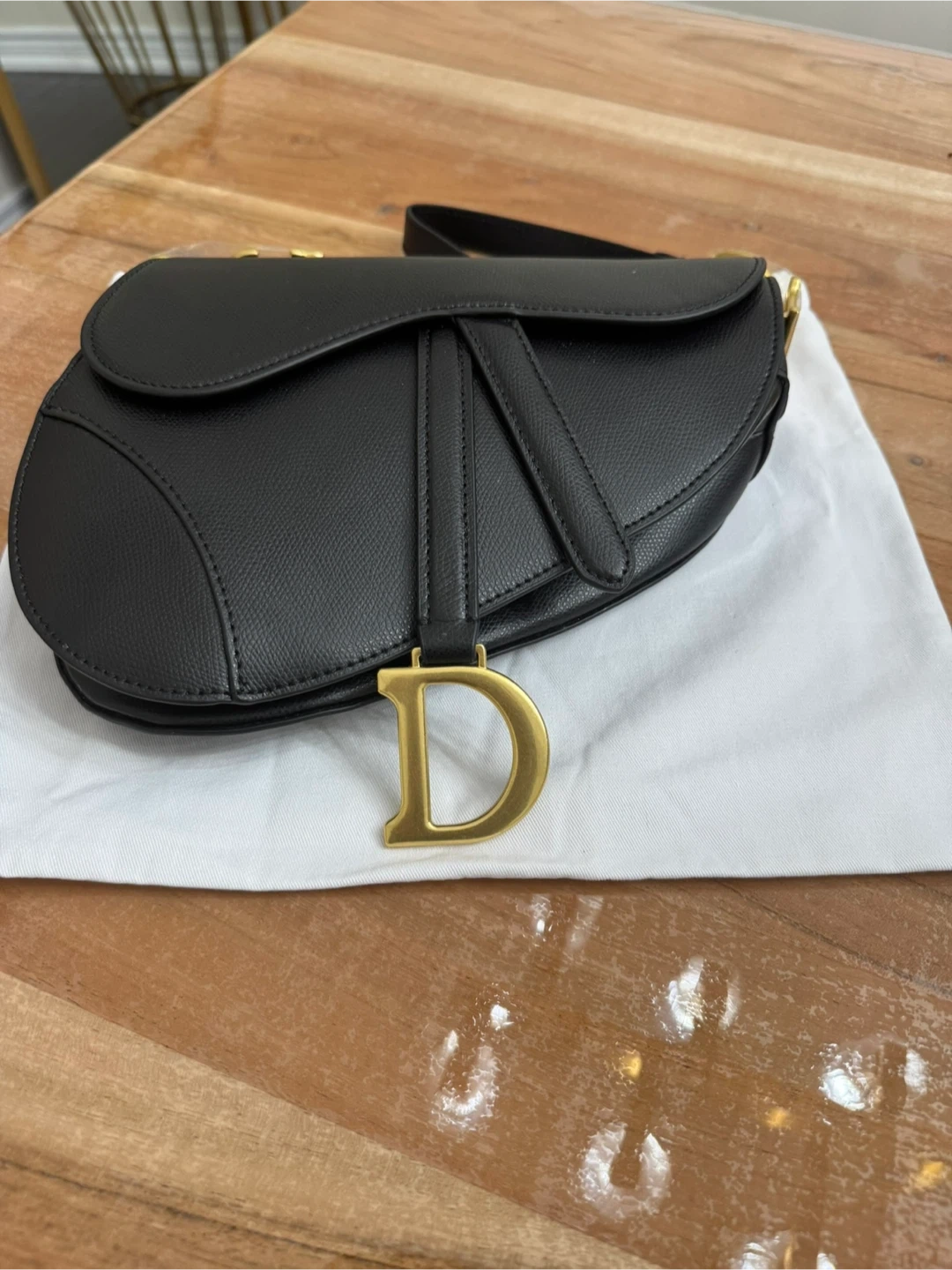 This is a black leather Christian Dior saddle bag. It features gold-tone hardware and an adjustable strap with "Christian Dior" detailing. Includes a dust bag.