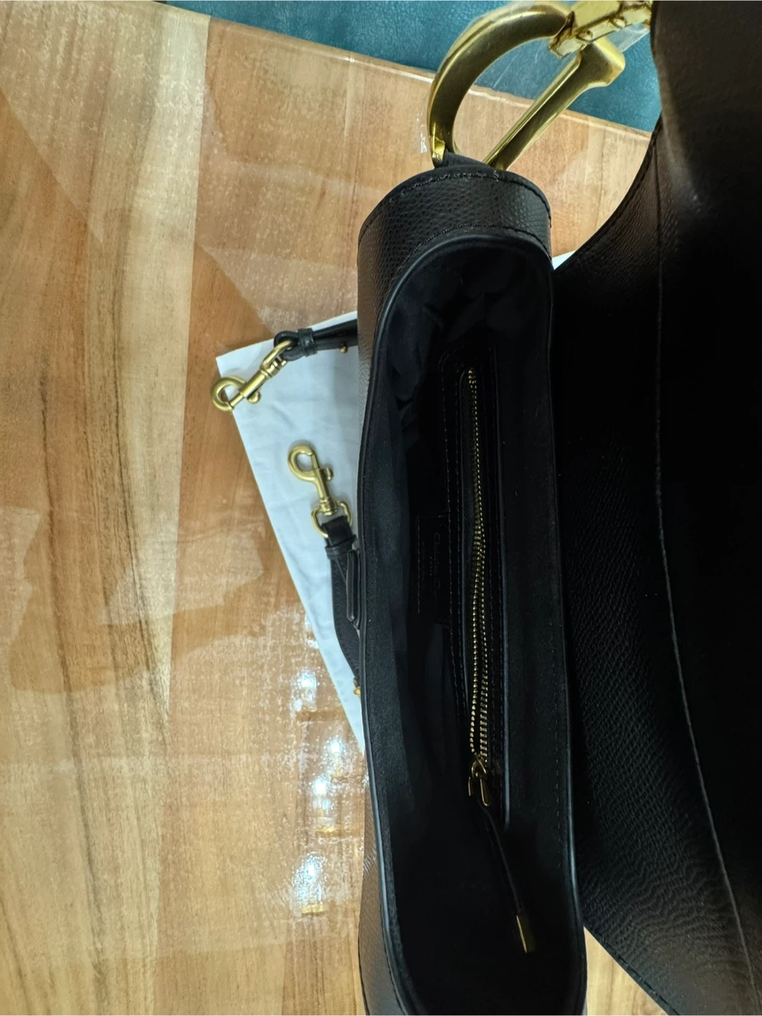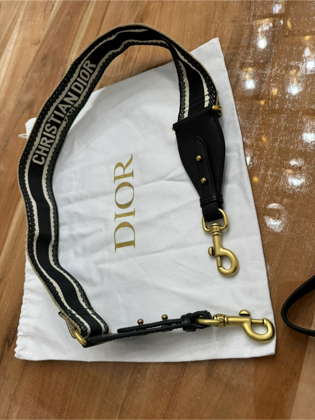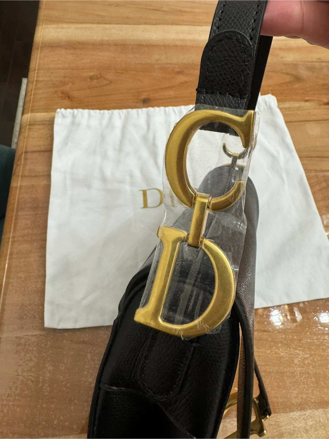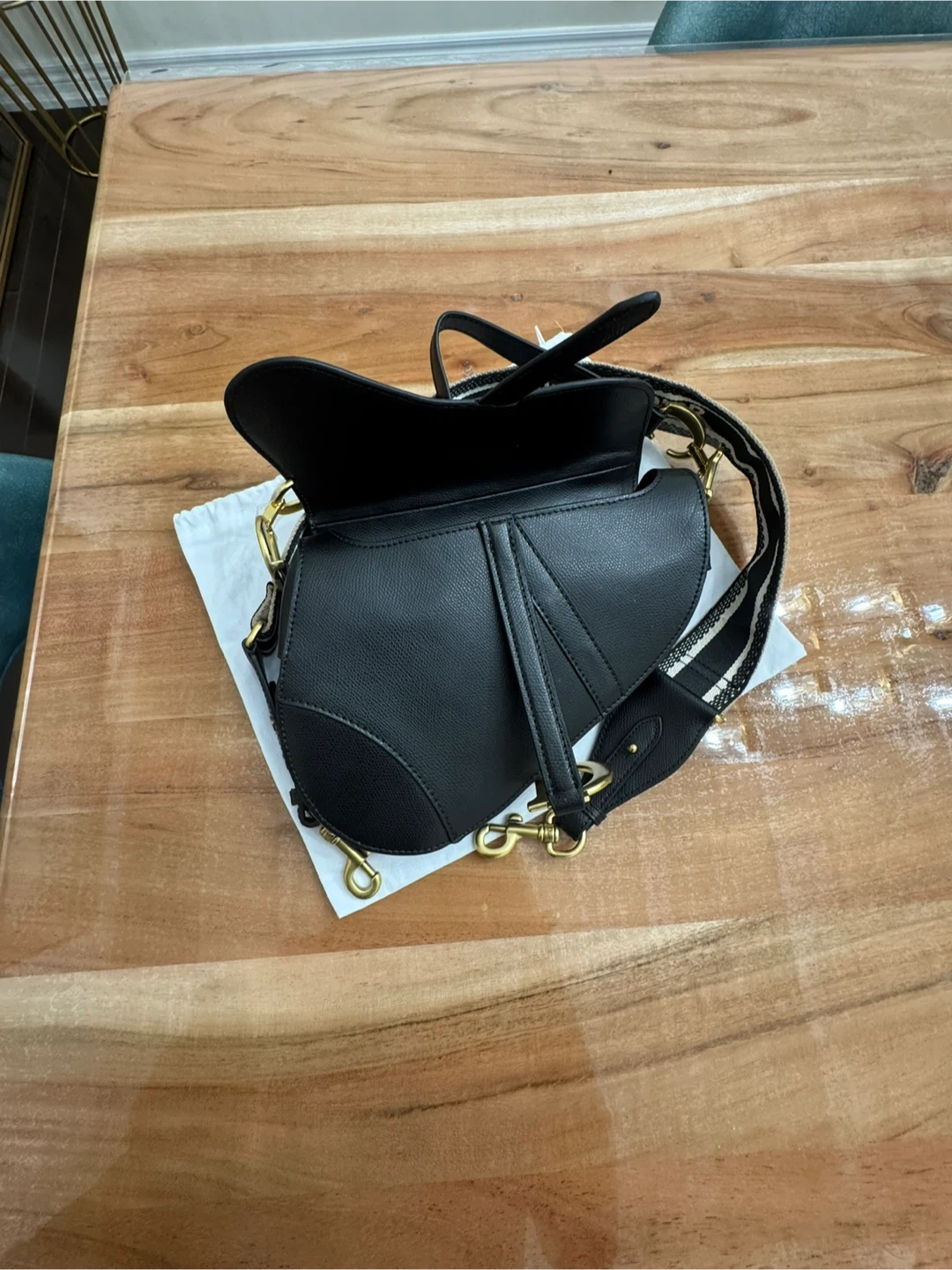 This is a black leather Christian Dior saddle bag. It features gold-tone hardware and an adjustable strap with "Christian Dior" detailing. Includes a dust bag.
