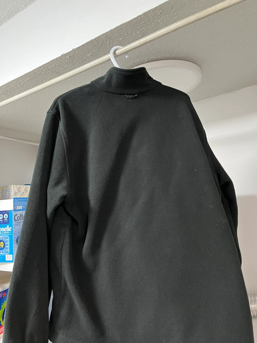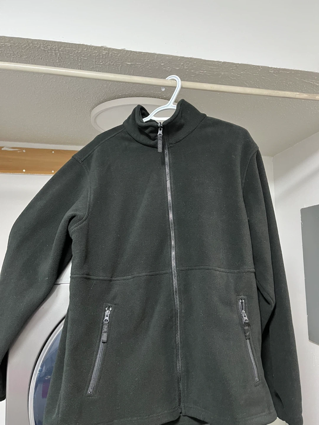 This is a black fleece jacket with a full zip front and two zippered hand pockets. It's made of soft, warm material and features a mock neck. A comfortable layering piece for cooler weather!
