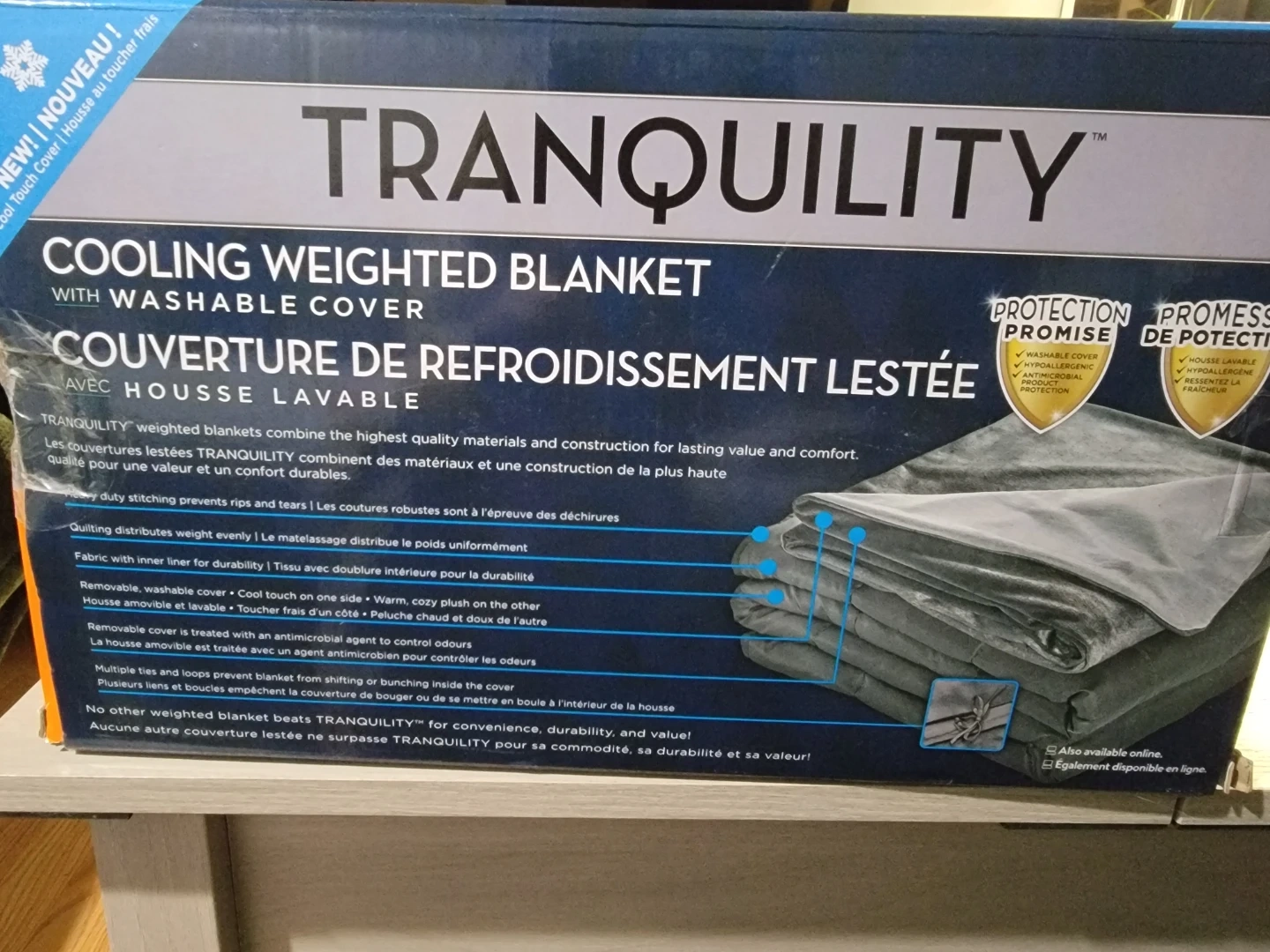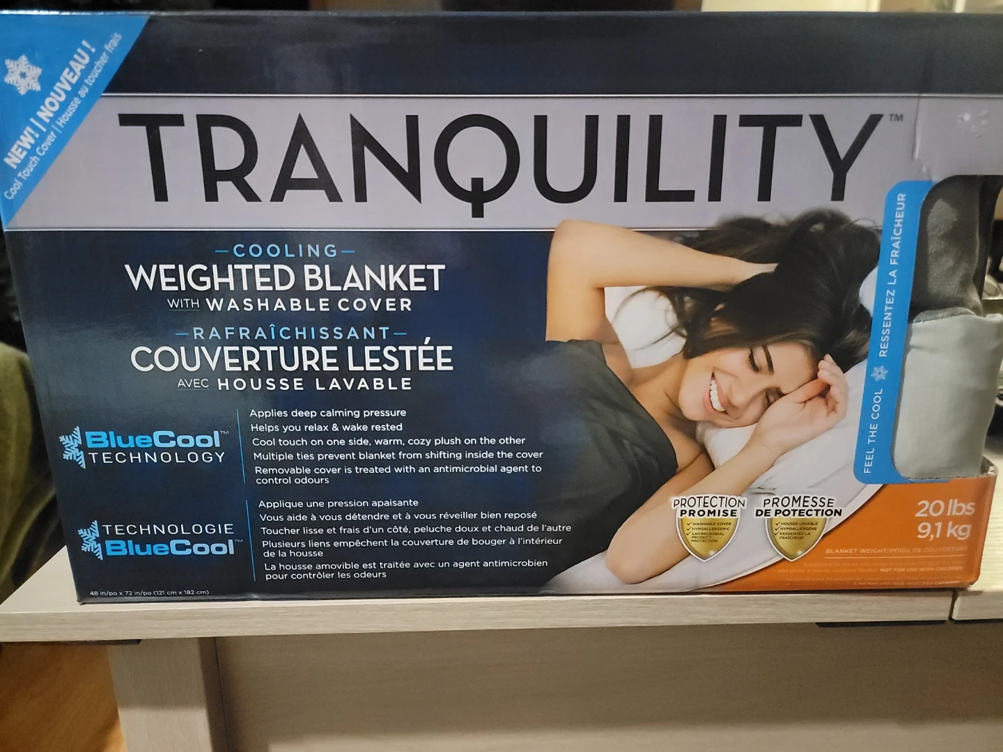 This Tranquility cooling weighted blanket comes with a washable cover. It features BlueCool Technology to help you relax and sleep rested. Multiple ties and loops prevent the blanket from shifting inside the cover.