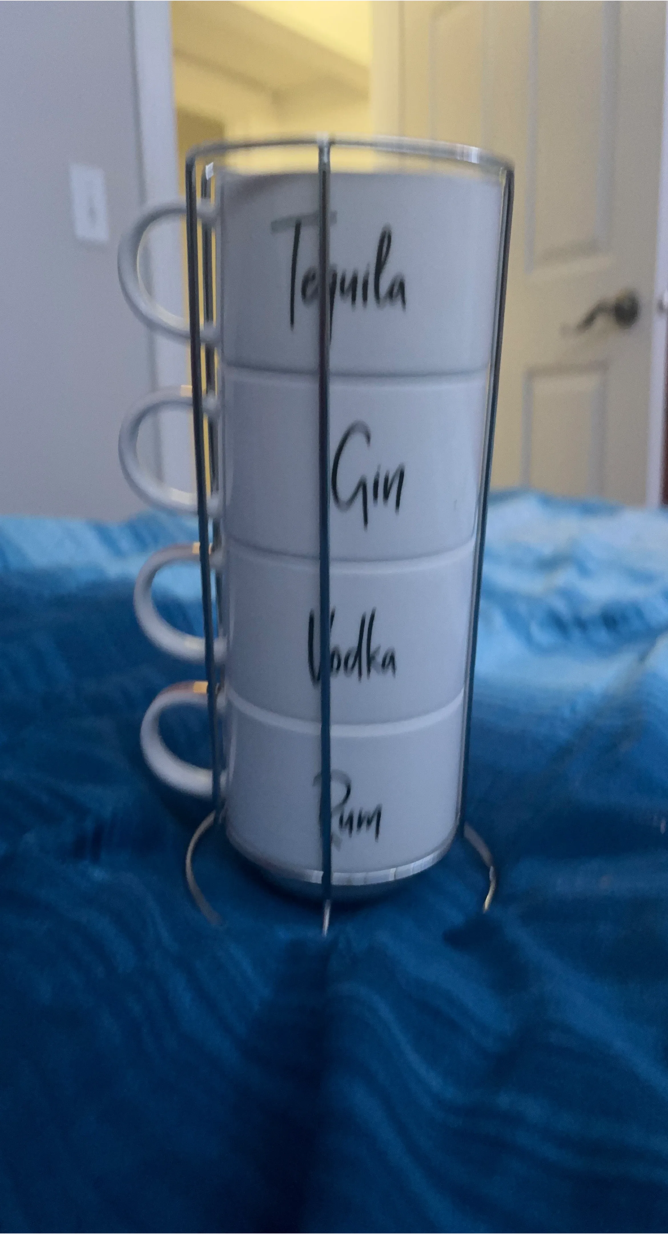 Set of four stackable shot glasses from Coco + Lola's Premium Collection. Each glass is labelled for Tequila, Gin, Vodka, and Rum. Made of ceramic and dishwasher safe.