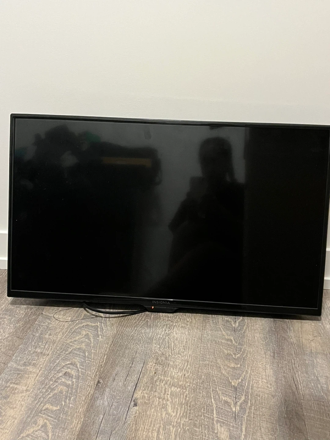 This is an Insignia black flat-screen TV. It's a reliable television for your viewing needs. It's suitable for a bedroom or secondary viewing area.