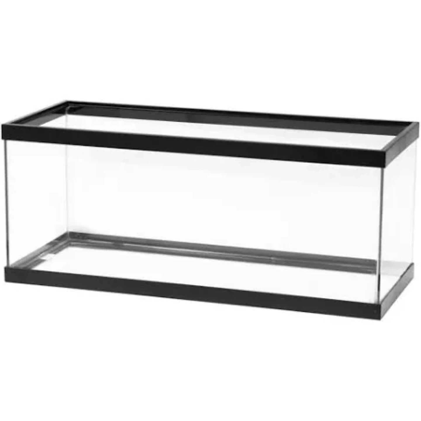 This is a standard glass aquarium tank. It features a black frame around the top and bottom edges. This tank is suitable for small pets or as a terrarium.