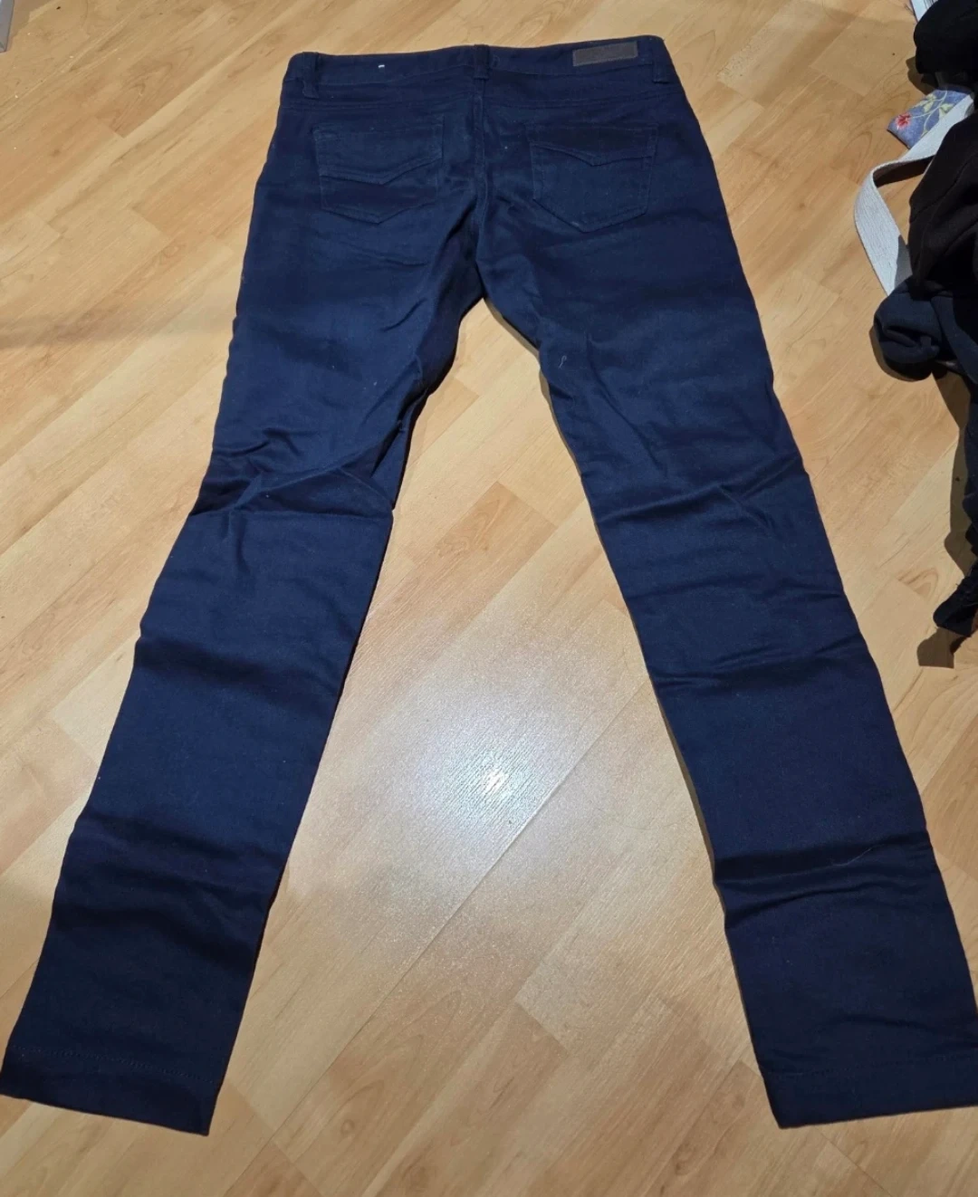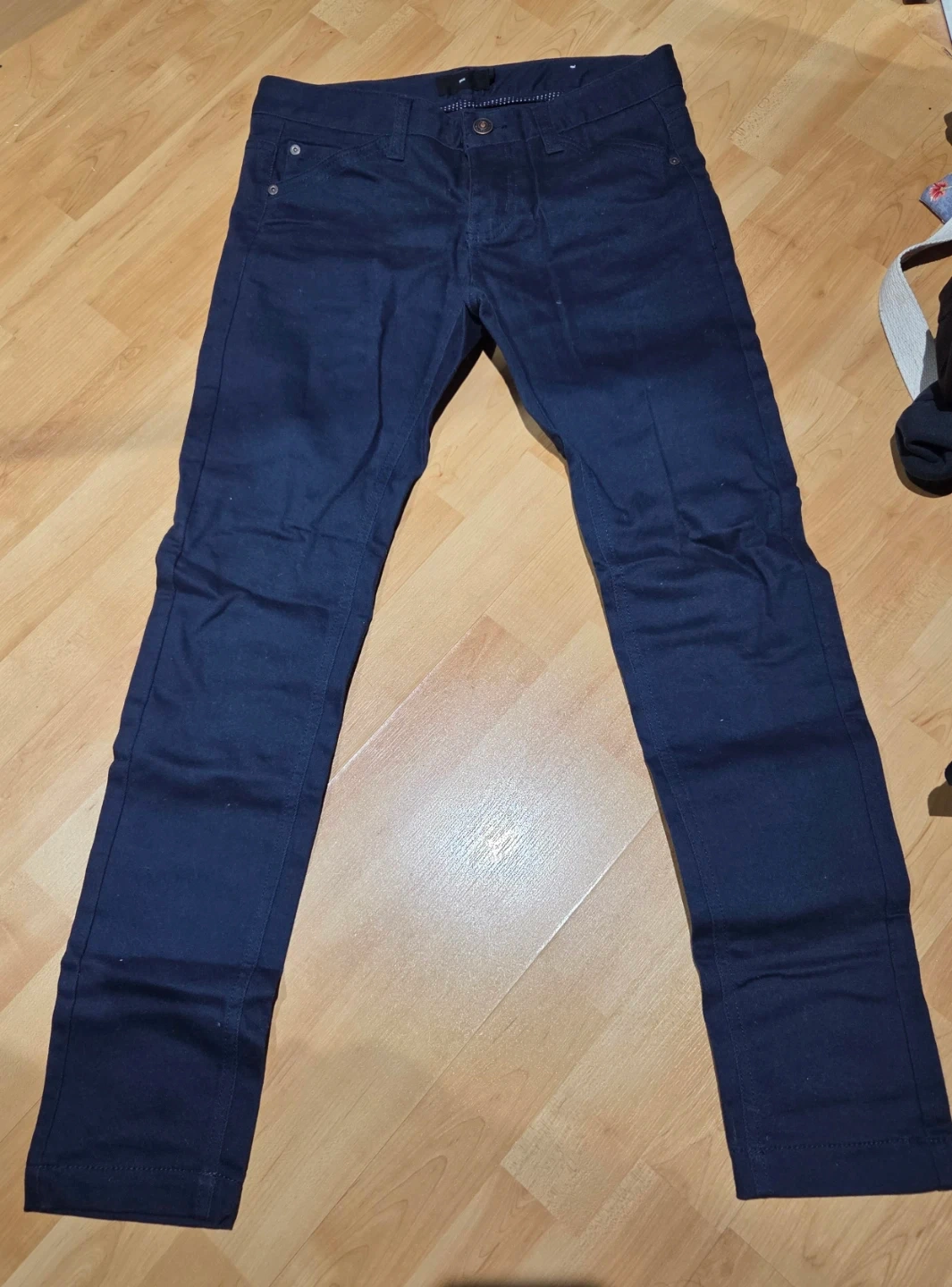 These navy blue slim fit pants are a versatile addition to any wardrobe. They feature a classic five-pocket design. Made from a comfortable cotton blend. Size 28. Brand new.