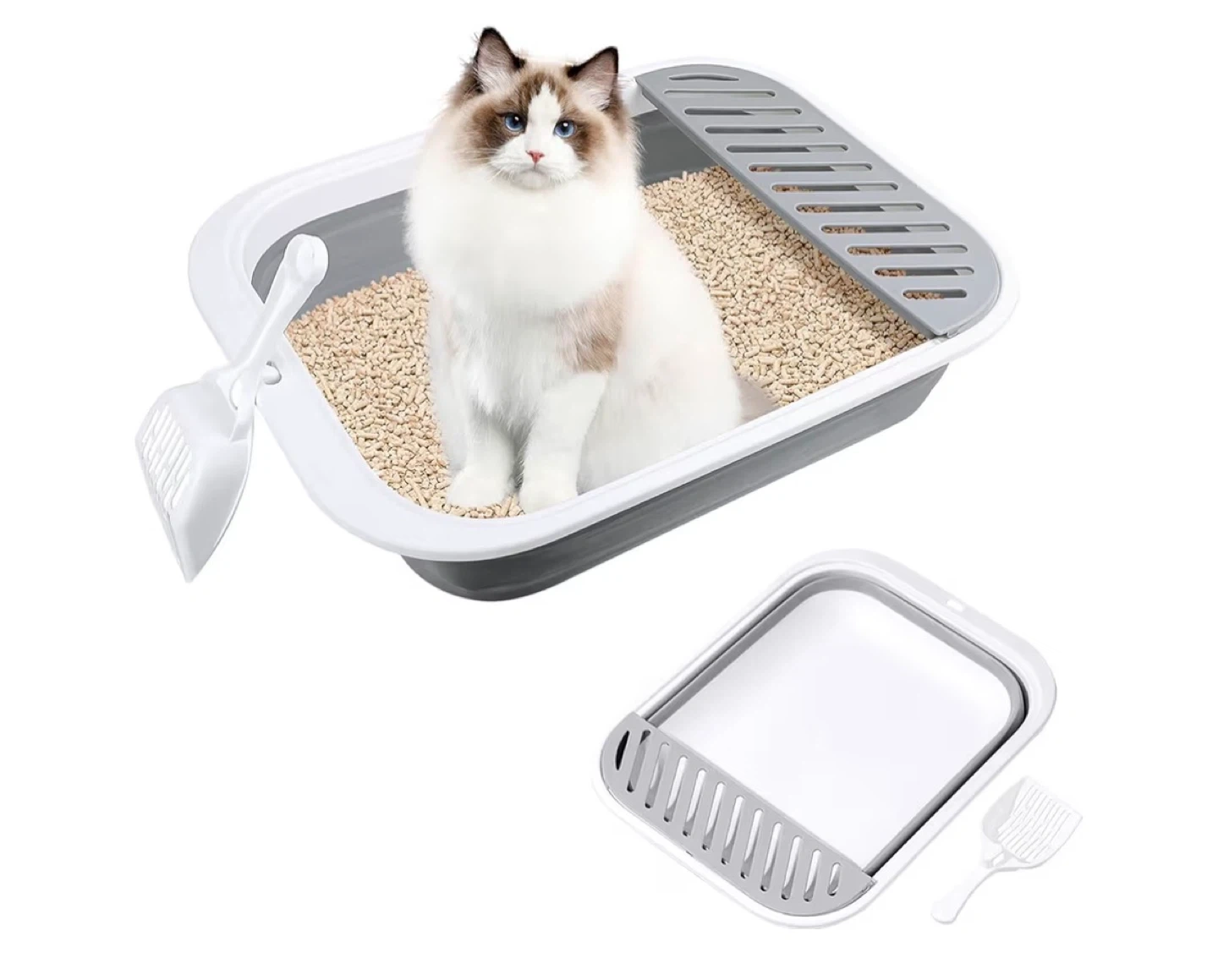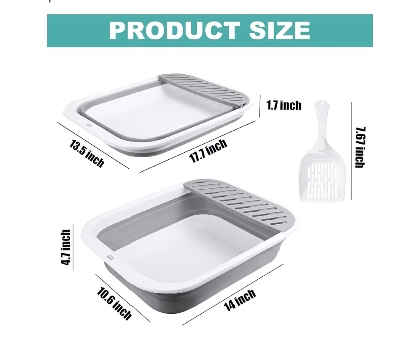This portable cat litter box features a collapsible design for easy storage. It's made of durable plastic and includes a matching litter scoop. The large space makes it comfortable for cats. A pedal design helps prevent litter scatter.