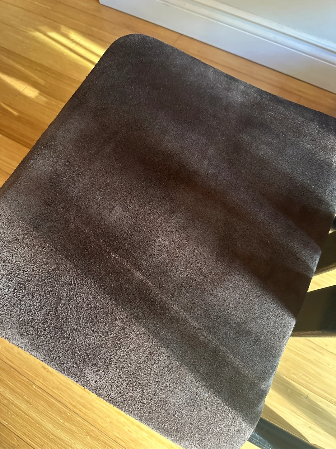 2 beautiful authentic Italian slat back chairs. Made by Montina, one of Italys most important mcm furniture design houses. Black lacquered solid pine wood. Newly upholstered in Full grain chocolate suede leather. Mint, solid condition & deceptively comfortable!