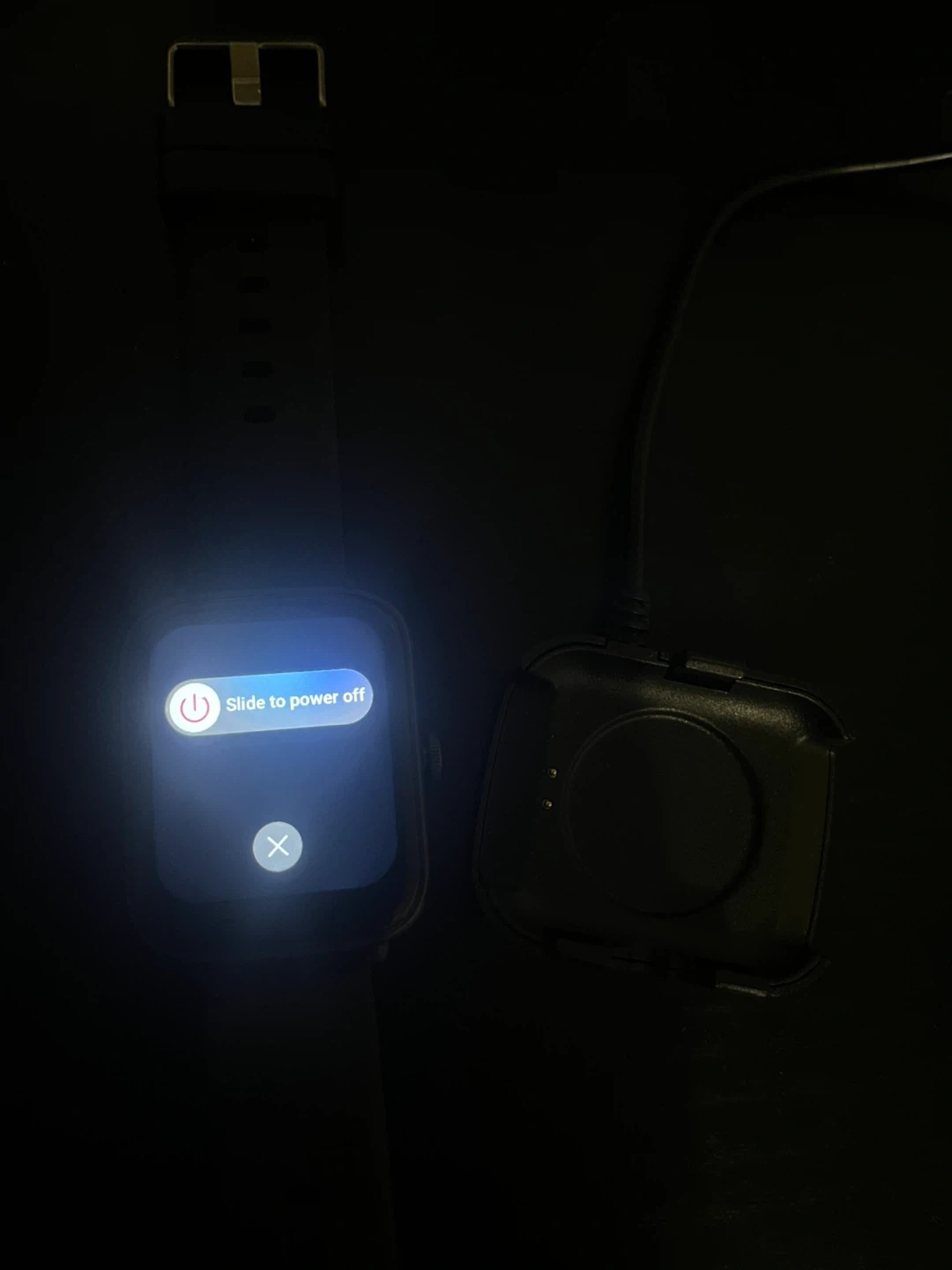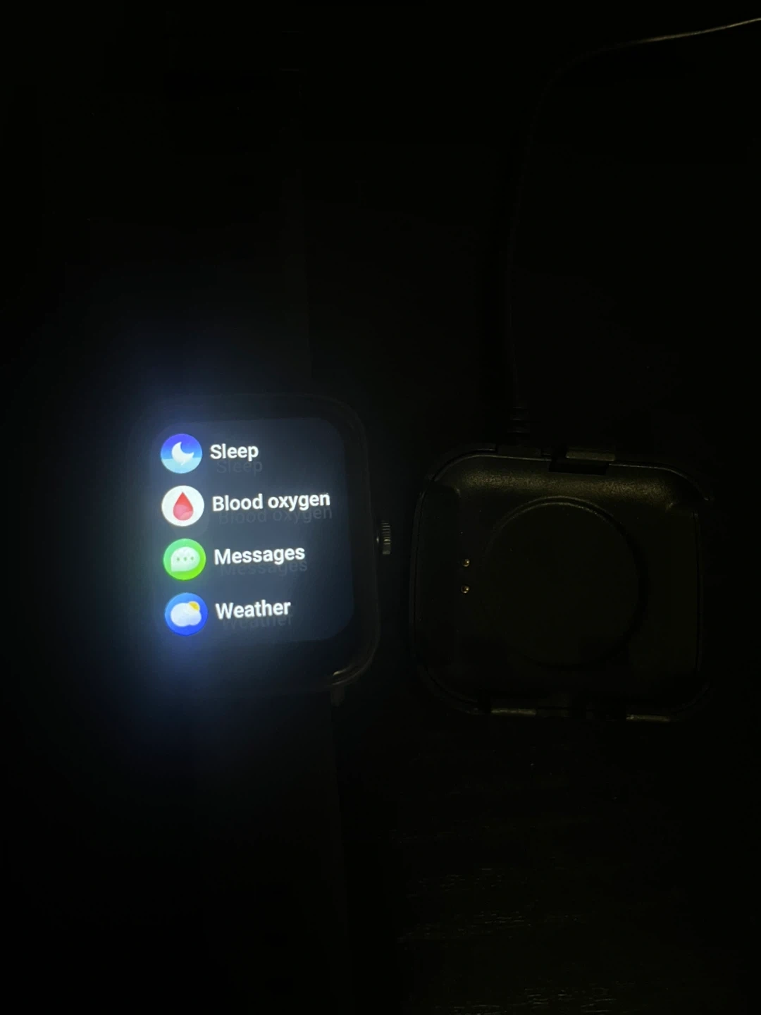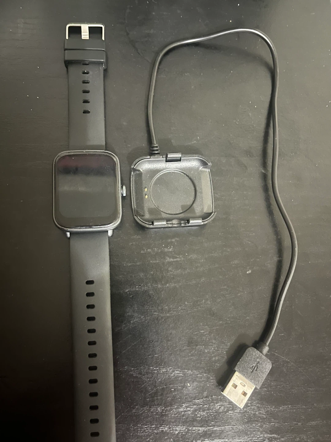 Black smart watch. Tracks sleep, blood oxygen, messages, and weather. Includes charging cable. Connects with the FitCloudPro app.
