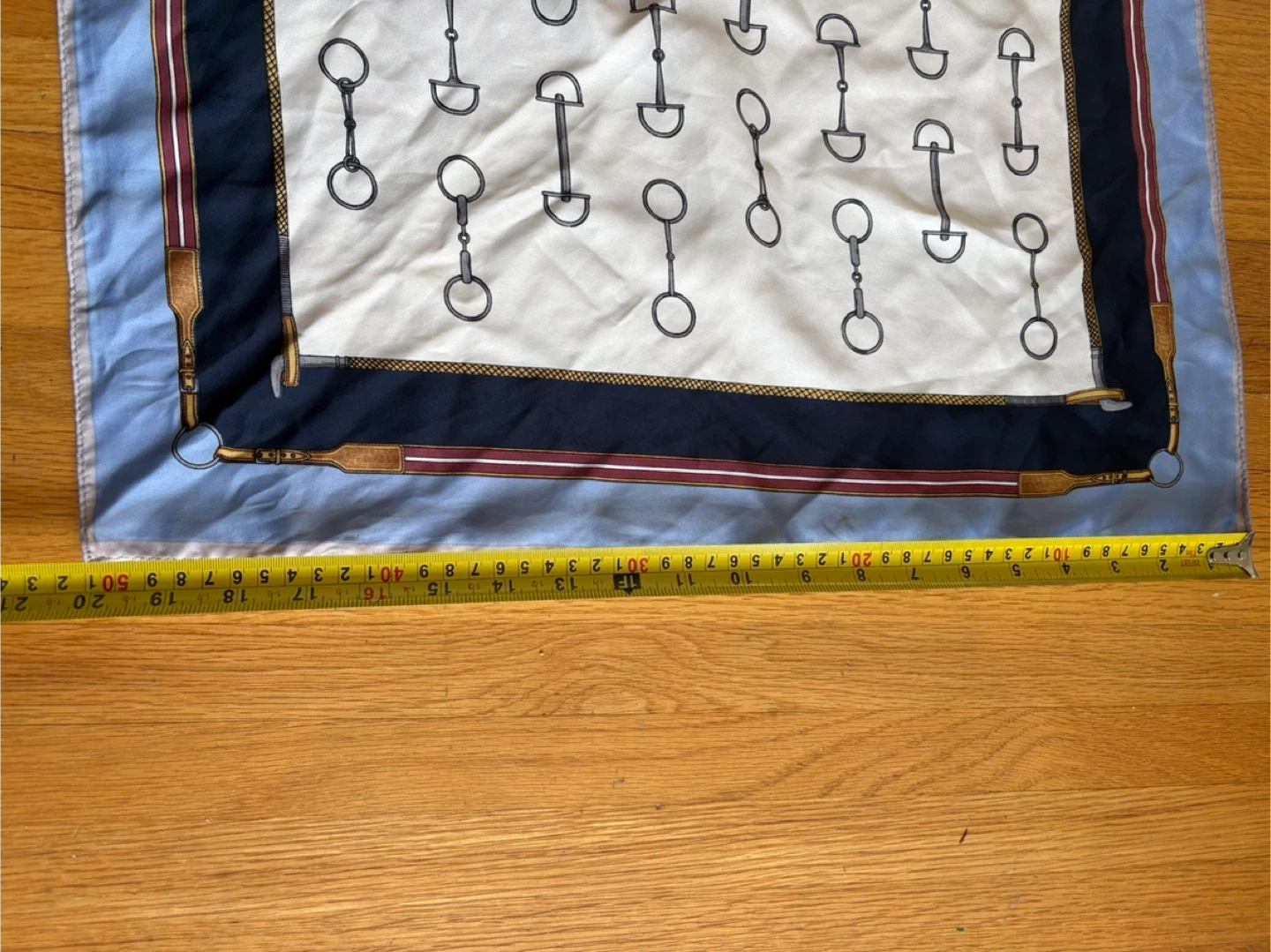 A classic silk square scarf featuring a repeating horse bit pattern on a cream background with a light blue border. This scarf is made from a smooth, silky material. It measures approximately 20 inches by 20 inches. Pickup at Morley trail NW