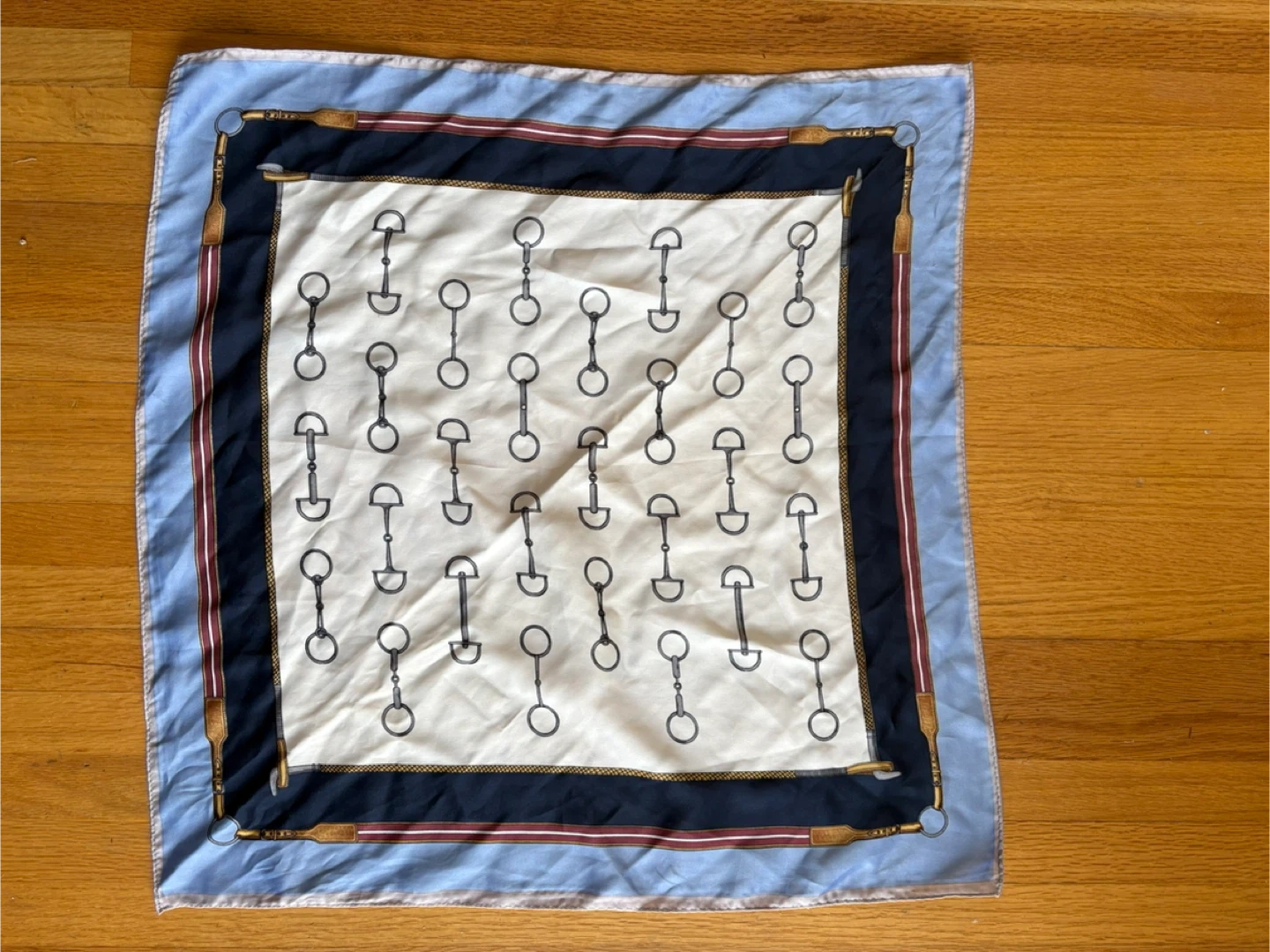 A classic silk square scarf featuring a repeating horse bit pattern on a cream background with a light blue border. This scarf is made from a smooth, silky material. It measures approximately 20 inches by 20 inches. Pickup at Morley trail NW