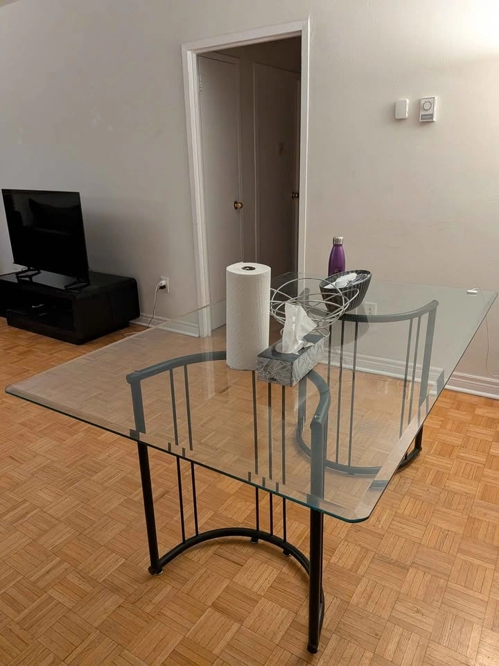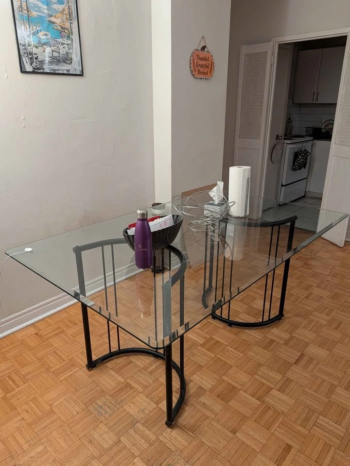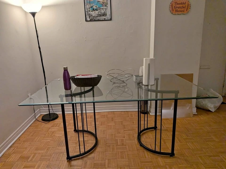 Stylish rectangular glass top table with bold, curved black metal bases. This piece has a cool postmodern/80s-inspired vibe with those half-circle tubular legs – super unique and eye-catching! Thick tempered glass top, sturdy black metal frame with semicircular curved supports on each end. Perfect as a dining table for 4, desk, console in an entryway/living room, or even a cool display table. Great for modern, minimalist, industrial, or retro decor setups. Easy to move (glass lifts off for transport). Dimensions: 66x40x29 inches. Pickup at 280 Wellesley St East.