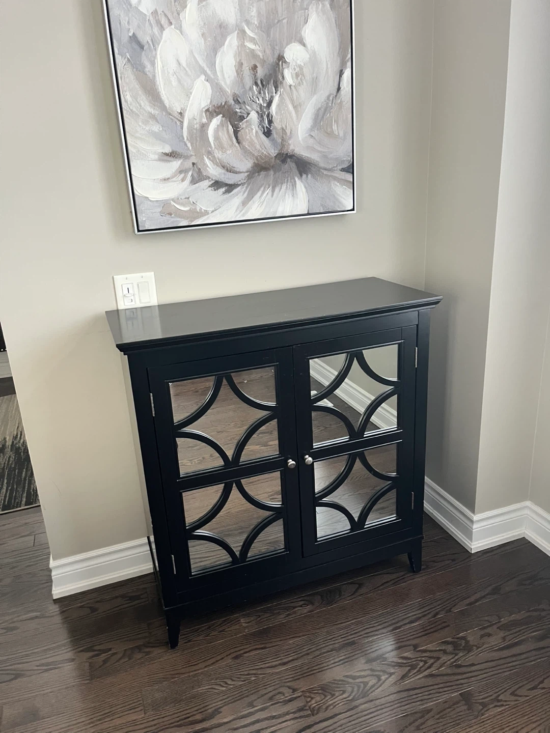 A stylish black cabinet with mirrored doors featuring a decorative geometric pattern. It has double doors and silver knobs for easy access. This cabinet would be great for storing items in a living room or entryway.