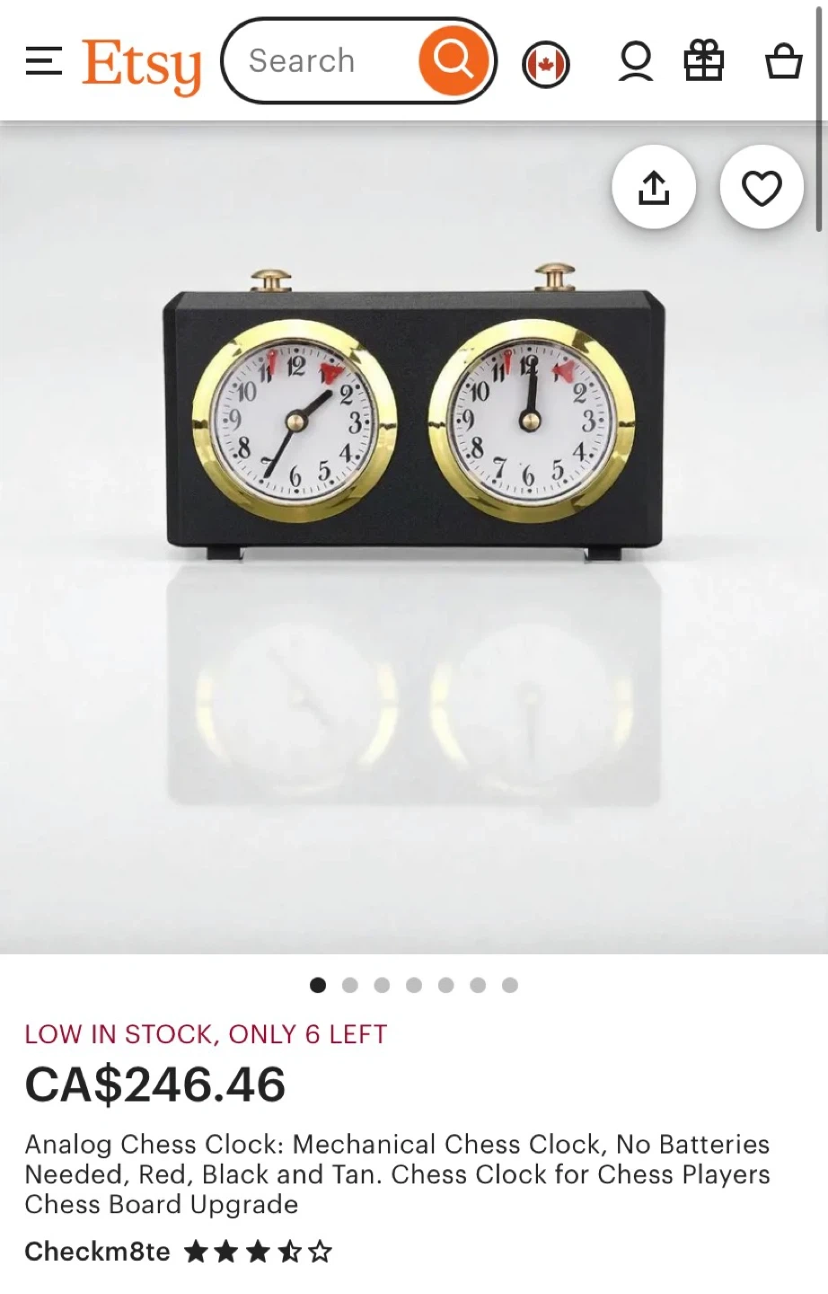 Meisterschach mechanical chess clock, no batteries needed. This clock is mechanical and operates without batteries, making it a reliable choice for chess players. It features red and tan accents on the clock faces. This chess clock is perfect for serious chess players looking for a durable and classic timing solution. Sells for $246 on Etsy.