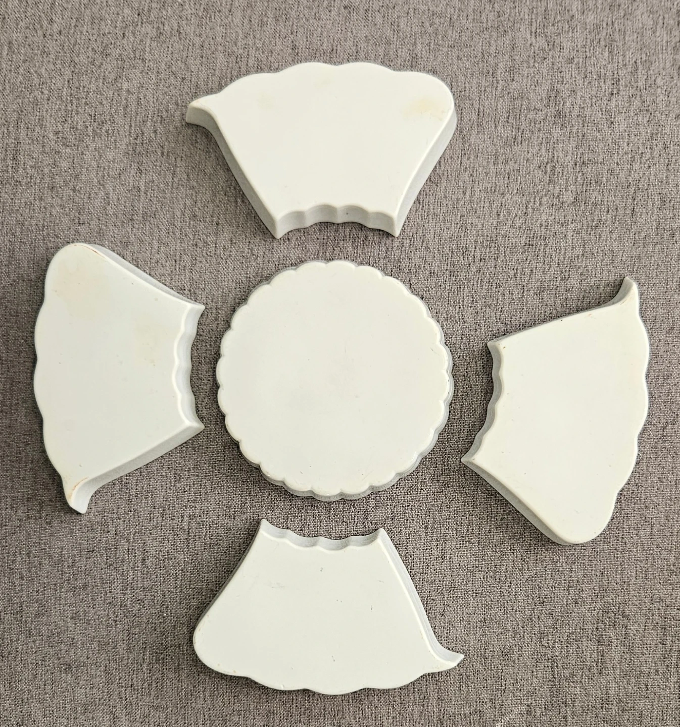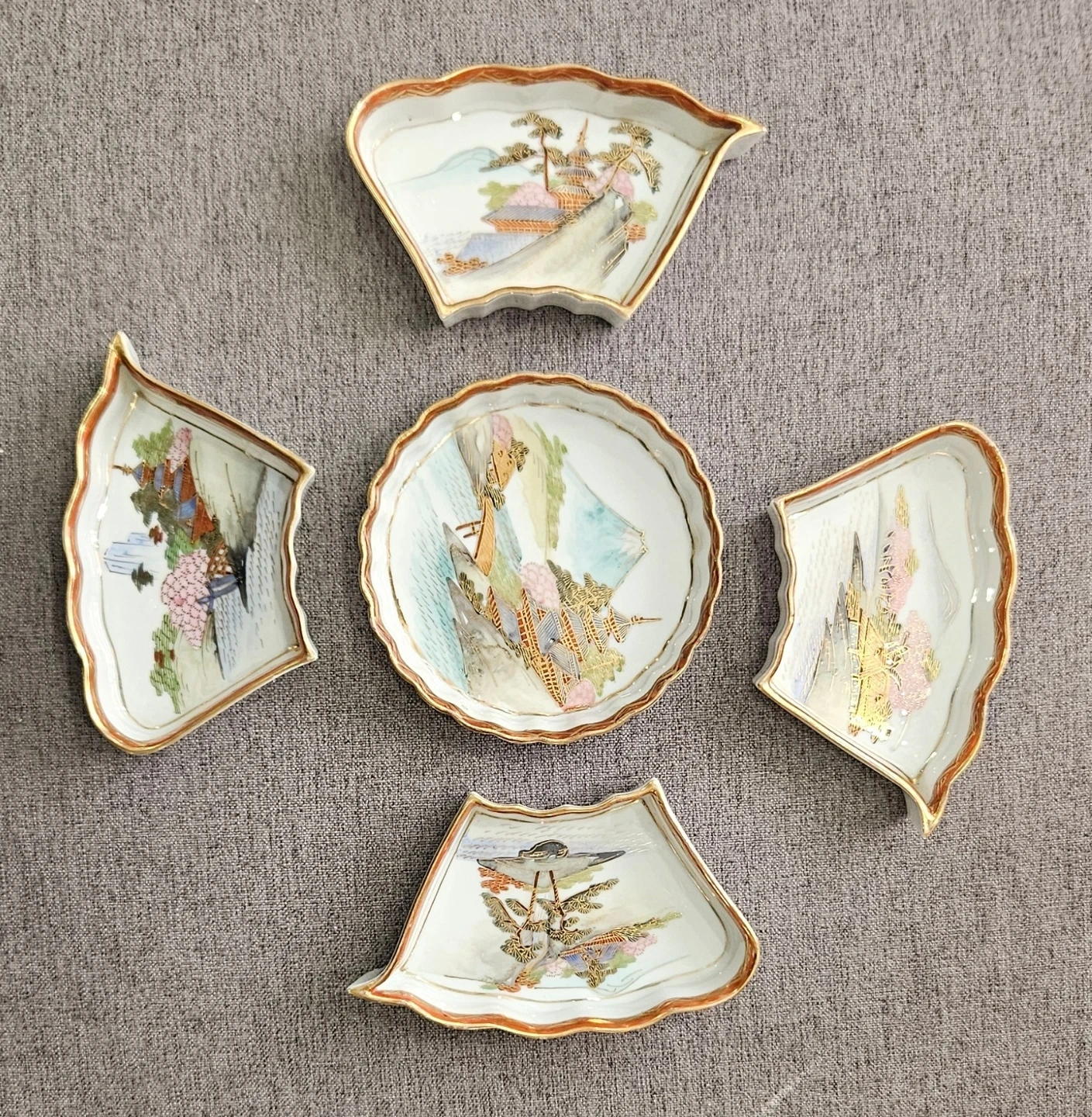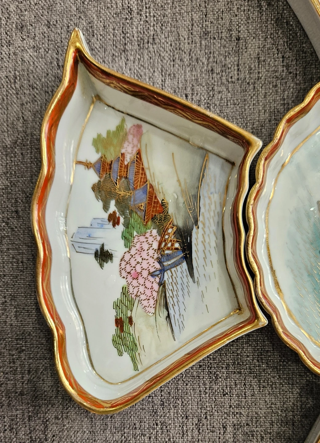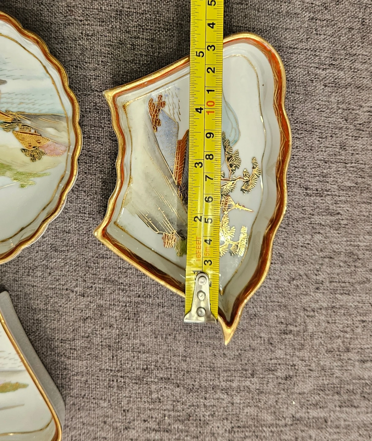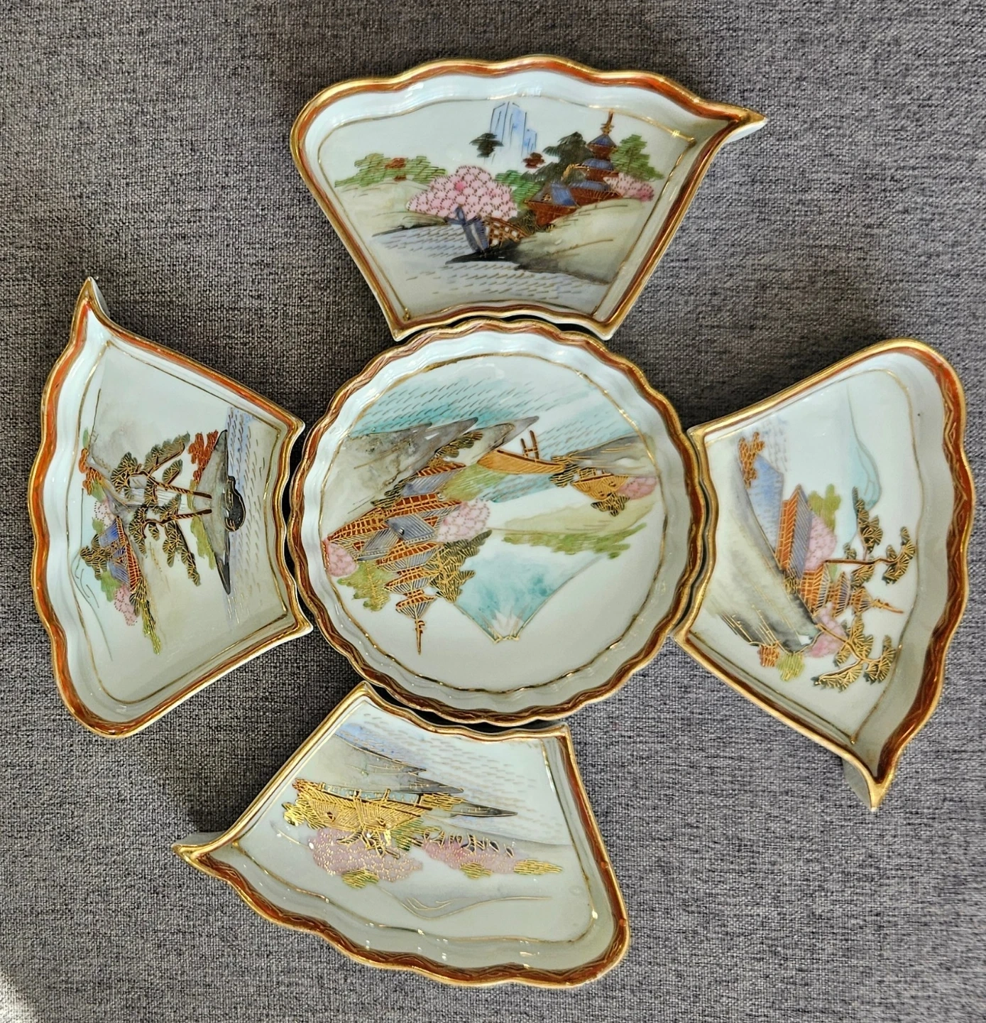 Set of five Japanese vintage intricate, hand-painted enamel designs porcelain dishes featuring intricate Japanese landscape scenes. Each dish has a scalloped edge with gold trim and a unique scenic painting. Great for display or serving small appetizers!
