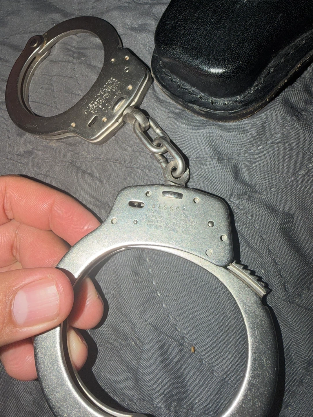 Classic silver metal handcuffs by Smith & Wesson. Features a hinged design for securement and includes a black leather restraint holder. Serial number visible.