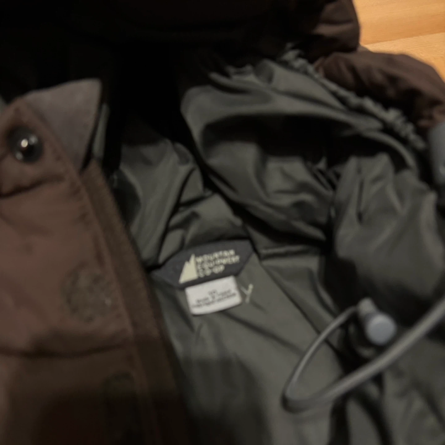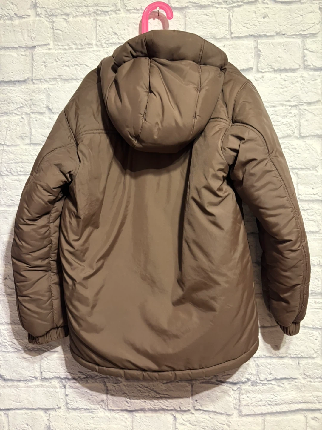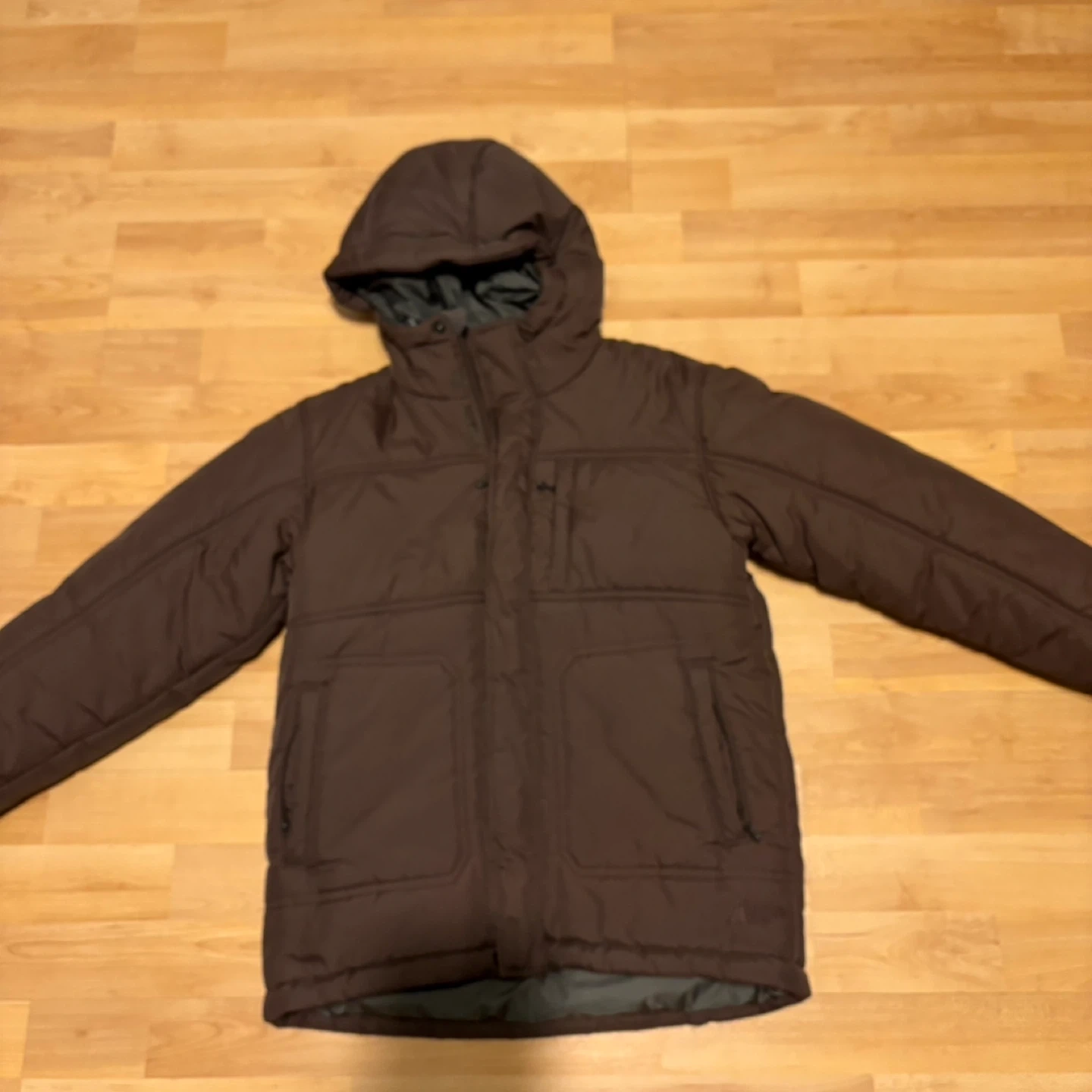Warm brown puffer jacket from Mountain Equipment Co-op. Shell is 100% Nylon with Polyurethane Coating, and the fill is 100% Polyester. It has a full zip front and a cozy hood. Perfect for staying warm on chilly days! Pick up only.
