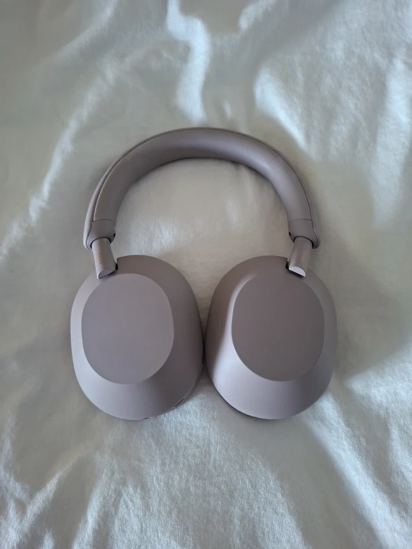 Sony WH-1000XM5 noise cancelling headphones in a light grey colour. These over-ear headphones offer industry-leading noise cancellation and excellent sound quality. The design is lightweight and comfortable for extended wear.