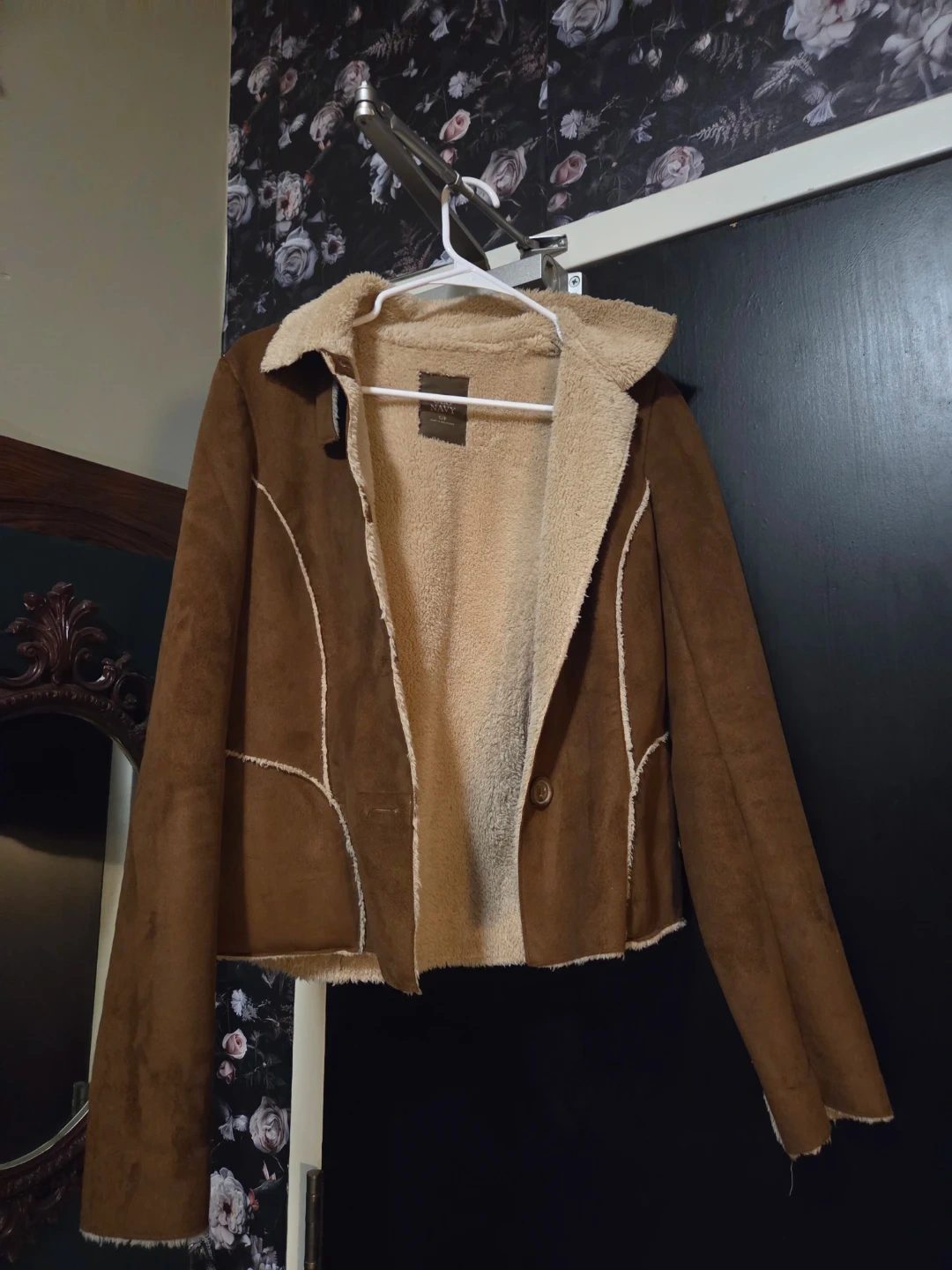 This Old Navy jacket features a faux suede exterior with a cozy sherpa lining. It's a size small and perfect for cooler weather. It has a classic button-up front and a stylish collar.