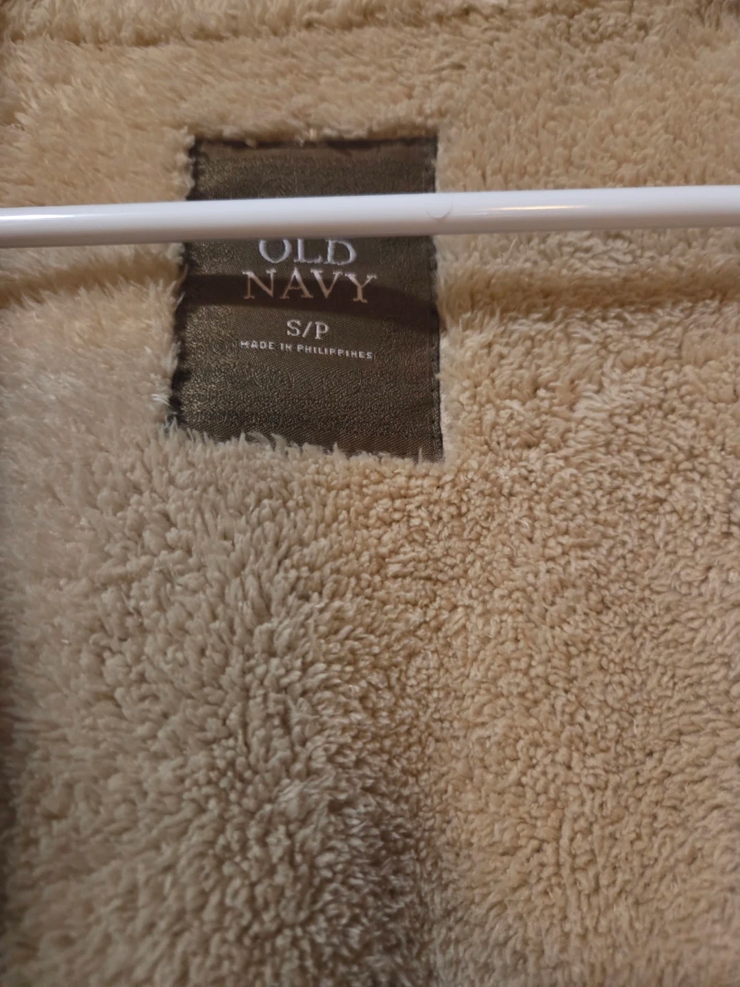 This Old Navy jacket features a faux suede exterior with a cozy sherpa lining. It's a size small and perfect for cooler weather. It has a classic button-up front and a stylish collar.