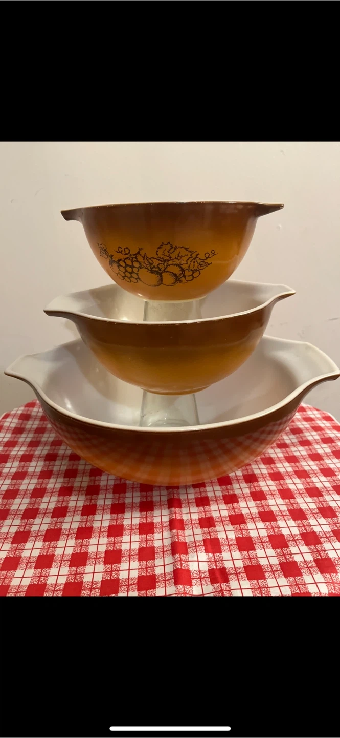 This is a set of three Pyrex mixing bowls in amber colour with a fruit pattern. They feature a white interior and a convenient handle. This set is perfect for all your baking and serving needs!
